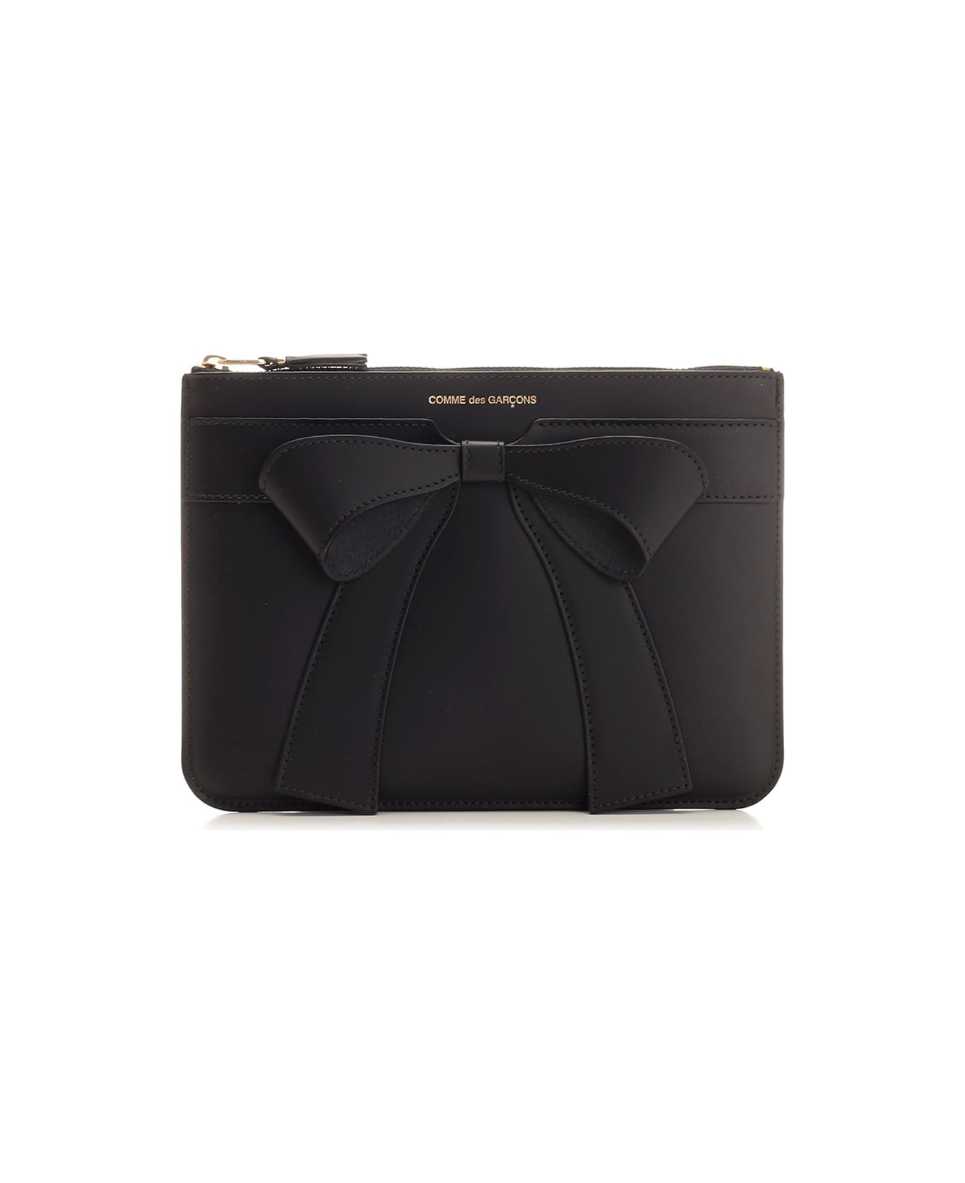 Large leather pouch with bow applied on the front and zip closure by Comme Des Garcons Wallet.