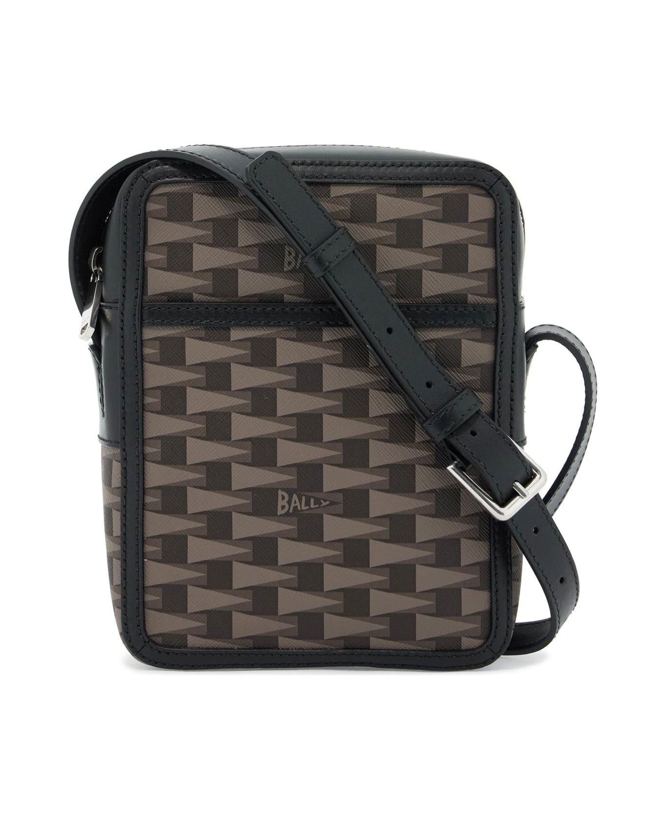 Bally crossbody bag made of Pennant-print coated canvas and smooth leather trim and adjustable shoulder strap. Zipper closure, lined interior with one zippered and one open pocket, additional slit pocket at front and silver-finish metalware.