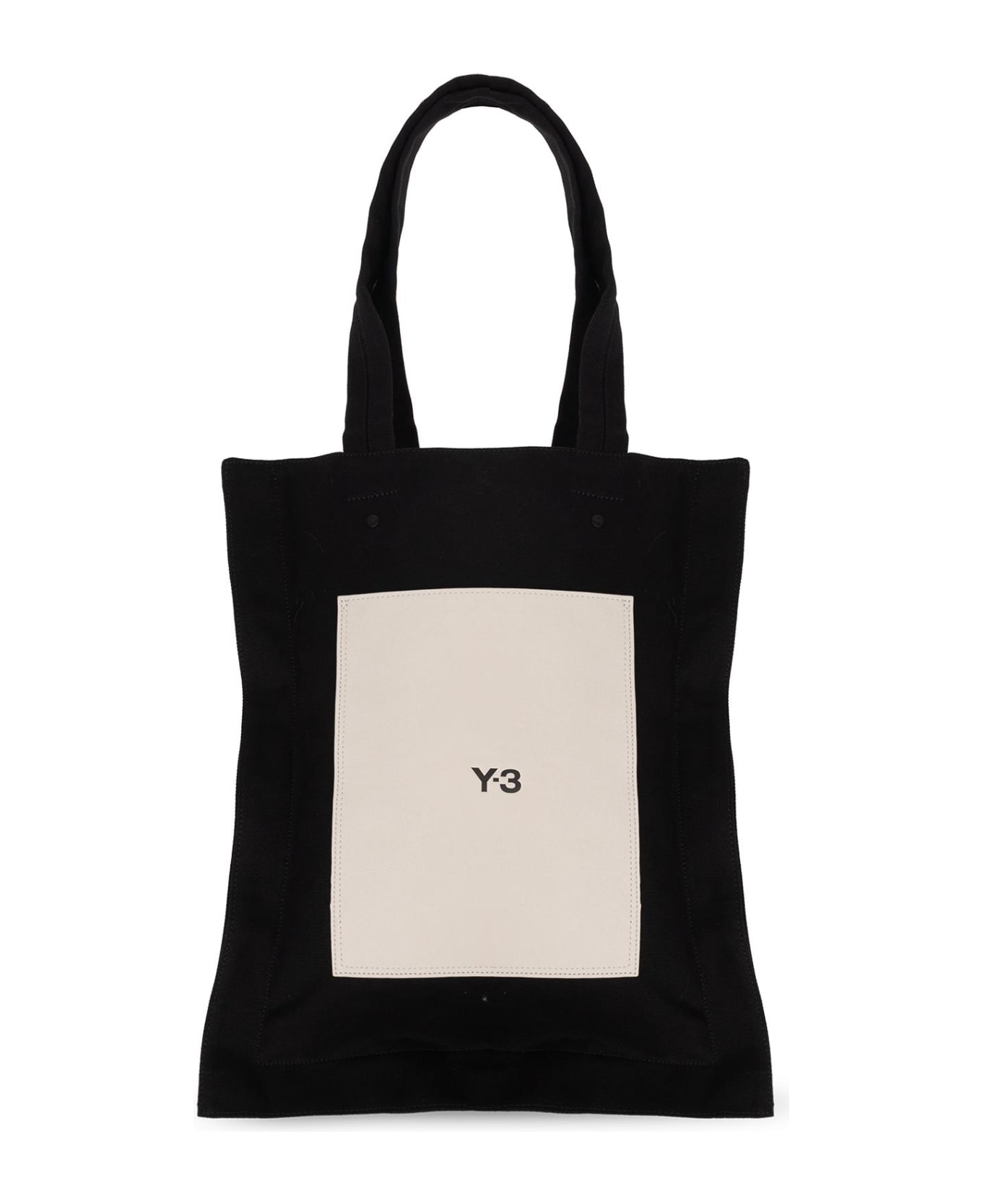Black shopper bag from Y3 Yohji Yamamoto. Made of organic cotton, this model features a light grey leather pocket on the front and back, one pocket decorated with a black embossed logo, two half-round handles, one internal compartment with one zip pocket