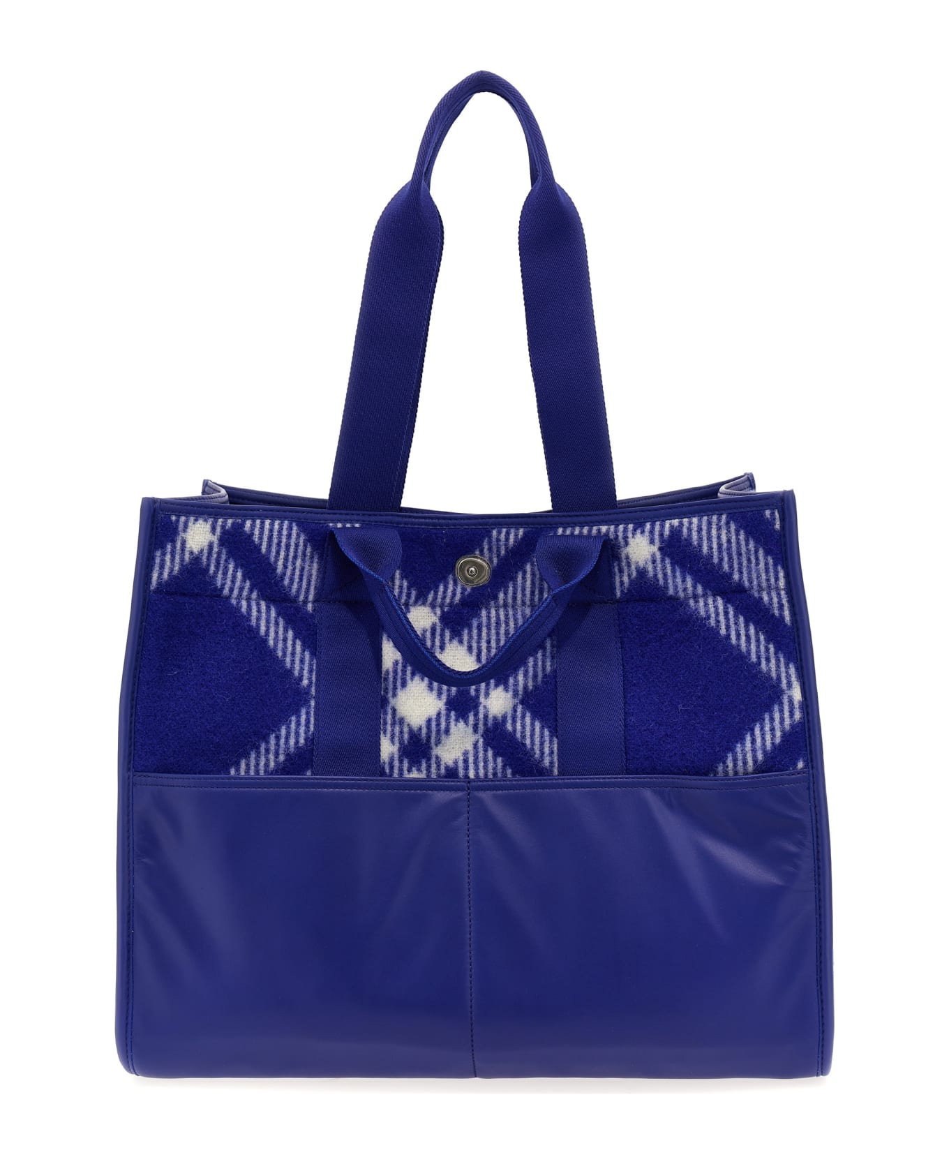 Wool shopping bag with check pattern, front pockets, and fabric handles.