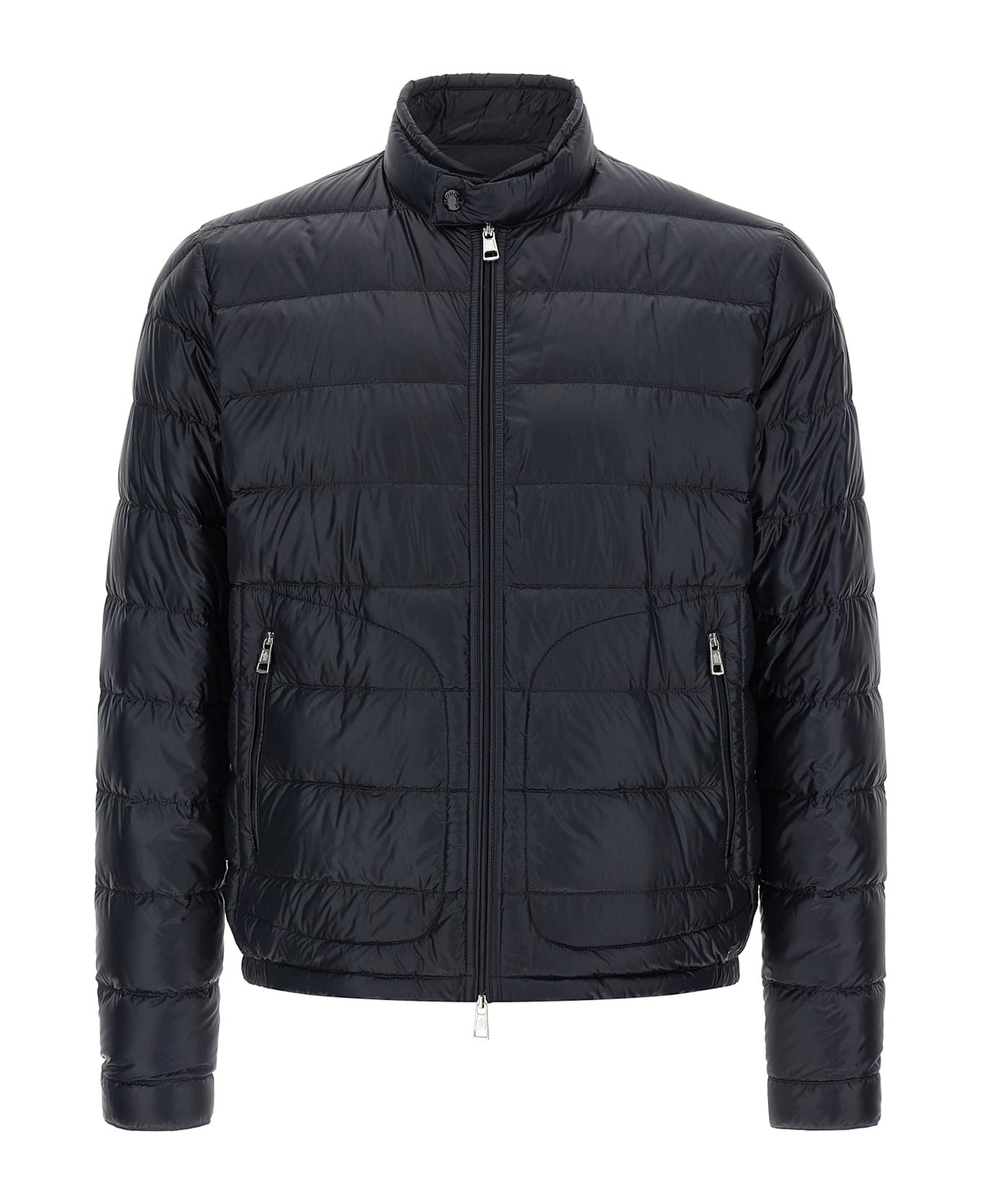 'Acorus' quilted long saison ue down jacket with quilted and slightly padded goose down padding, front zip closure, high neck with snap button closure, pockets, long sleeves with cuffs and logo patch appliqué, elastic at the hem.