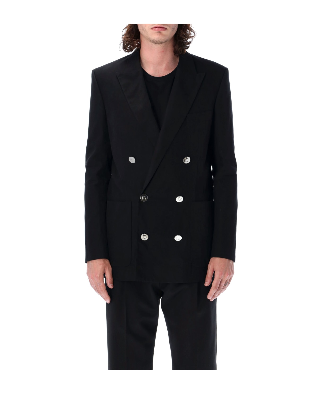 Monogram Buttons Blazer By Balmain. Featuring: Peak Lapels Double-breasted Button Fastening Embossed Monogram Buttons Padded Shoulder Chest Pocket Two Patch Pockets Long Sleeves Buttoned Cuffs Back Vent Lined Model Is 1,90 M Tall And He Is Wearing Size 50