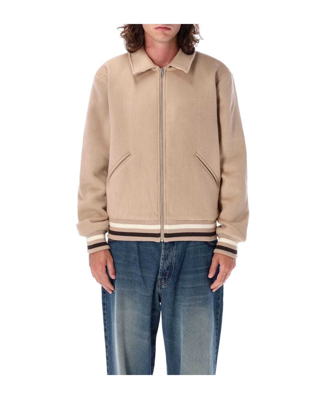 Varsity Jacket By Pop Trading Company. Featuring: Regular Fit Wool Blend Fabric Shirt-style Collar Long Sleeves With Ribbed Cuffs Front Zip Closure Two Side Welt Pockets Embroidered pop Logo On The Back Model Is 1,90m And Wears Size L.