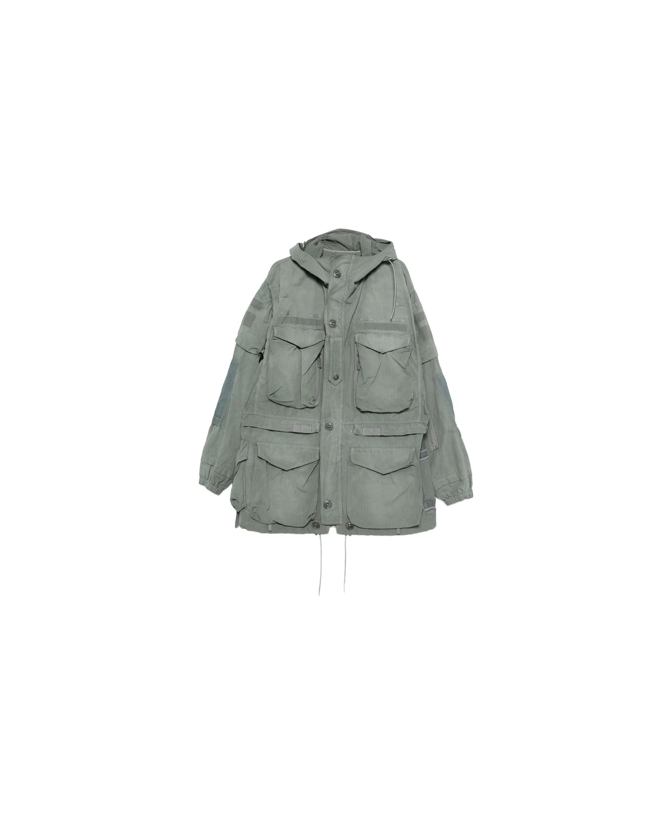grey pinstripe pattern front flap pockets zip fastening long sleeves drawstring hem