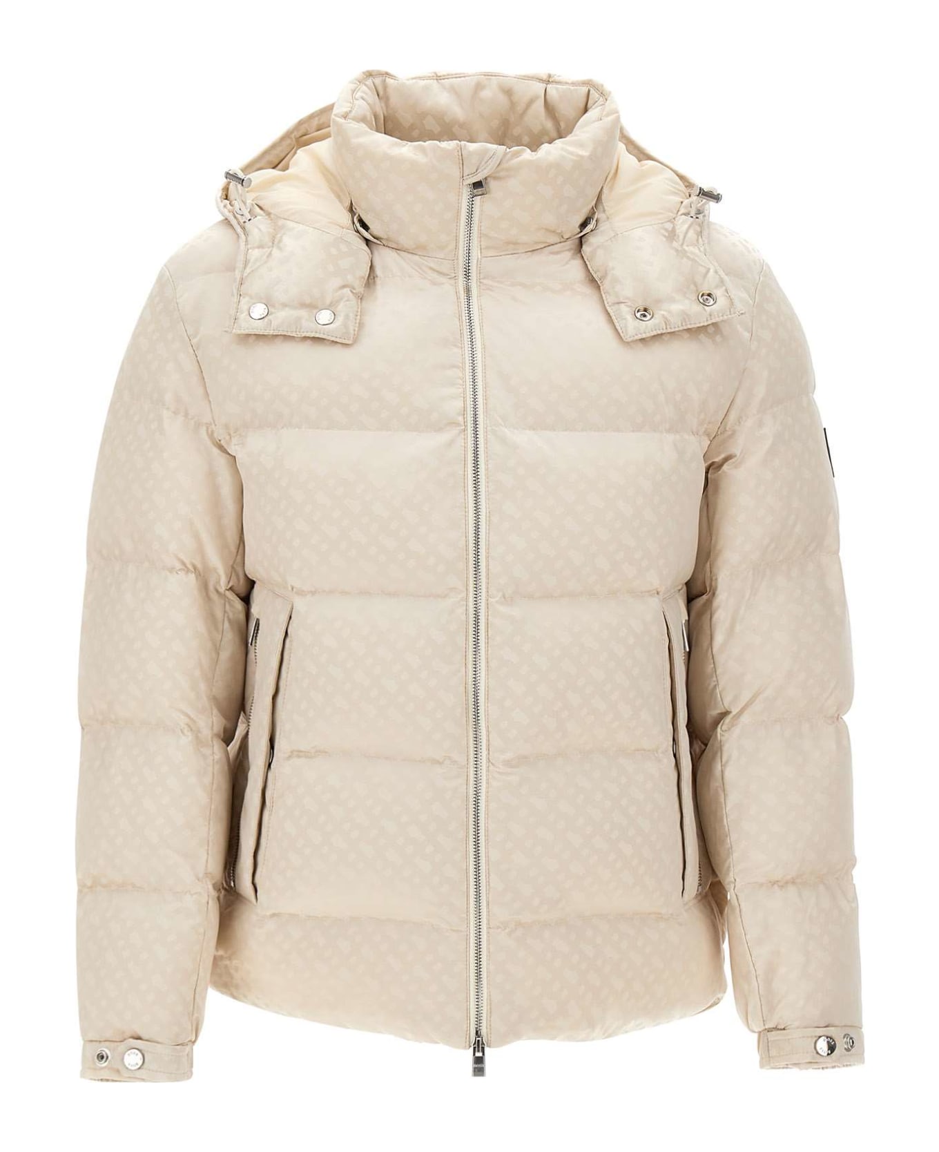 Boss "Corbinian" men's down jacket, ivory on all over monogram jacquard pattern, light and warm padding, horizontal quilting, water repellent and windproof, removable and adjustable hood with drawstring, logo patch on left sleeve, adjustable cuffs with buttons, front closure with double zip slider, regular fit. Regular back length: 73cm.