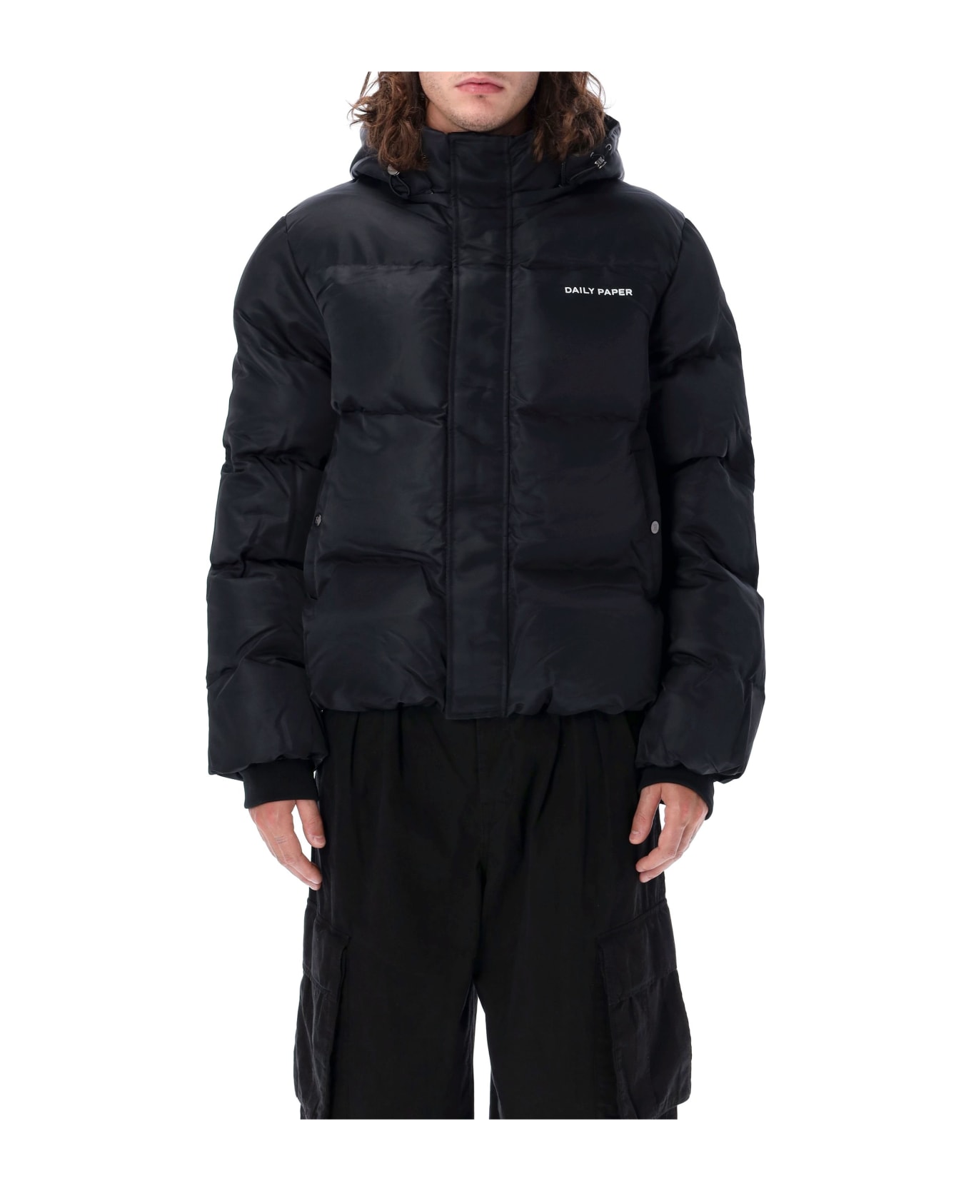 Epuffa Puffer Jacket By Daily Paper. Featuring: High Collar Removable Hood Concealed Zip And Snap Closure At Front Side Snap Pockets Ribbed Cuffs Printed Logo At Chest Stitching Details Custom Monogram Lining Elasticated Hem Padded Oversized Model Is 1,90 M Tall And He Is Wearing Size L