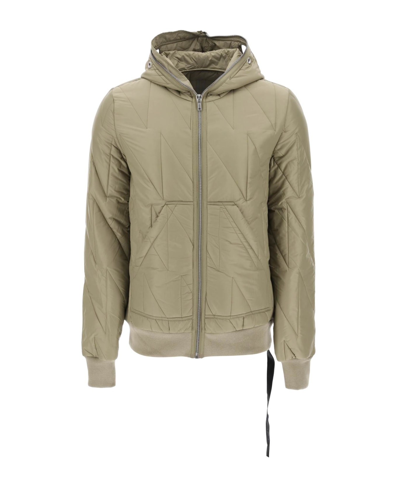 Drkshdw light padded jacket made of recycled nylon with graphic quilting. This hooded style can be zipped up completely to cover the face, the hood is conveniently designed with openings for the eyes and ventilation eyelets. It is finished with ribbed cuffs and hem, split pouch pockets, and an internal logo tape. Synthetic padding. The model is 187 cm tall and wears a size M.