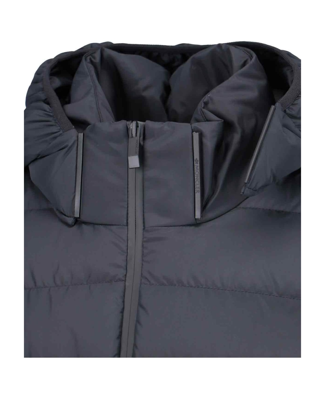 Moncler Jeluz logo short down jacket in black nylon with quilted and padded design, removable hood, double zip closure, two welt pockets with side zip, black logo patch on the side, straight hem, drawstring detail on the bottom. composition: 100% polyester size and fit: regular fit