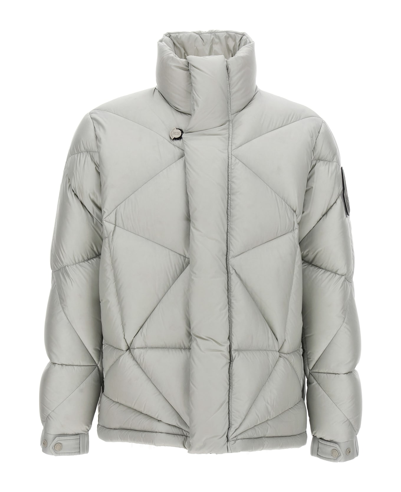 Moncler Genius x Pharrell Williams 'Oak' down jacket with goose down padding, high neck, snap button closure and covered zip, and maxi logo patch on the sleeve.