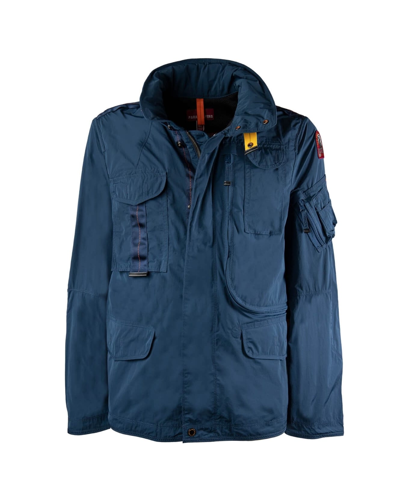 Parajumpers Denali Spring jacket made of water-repellent technical fabric in shades of blue. Retractable hood with drawstring, multiple pockets on the front and reinforced patches on the elbows. Adjustable drawstring at the waist and double-slider zip closure hidden by a flap with press studs. Iconic yellow PSJ elastic strap and logo patch on the left sleeve.