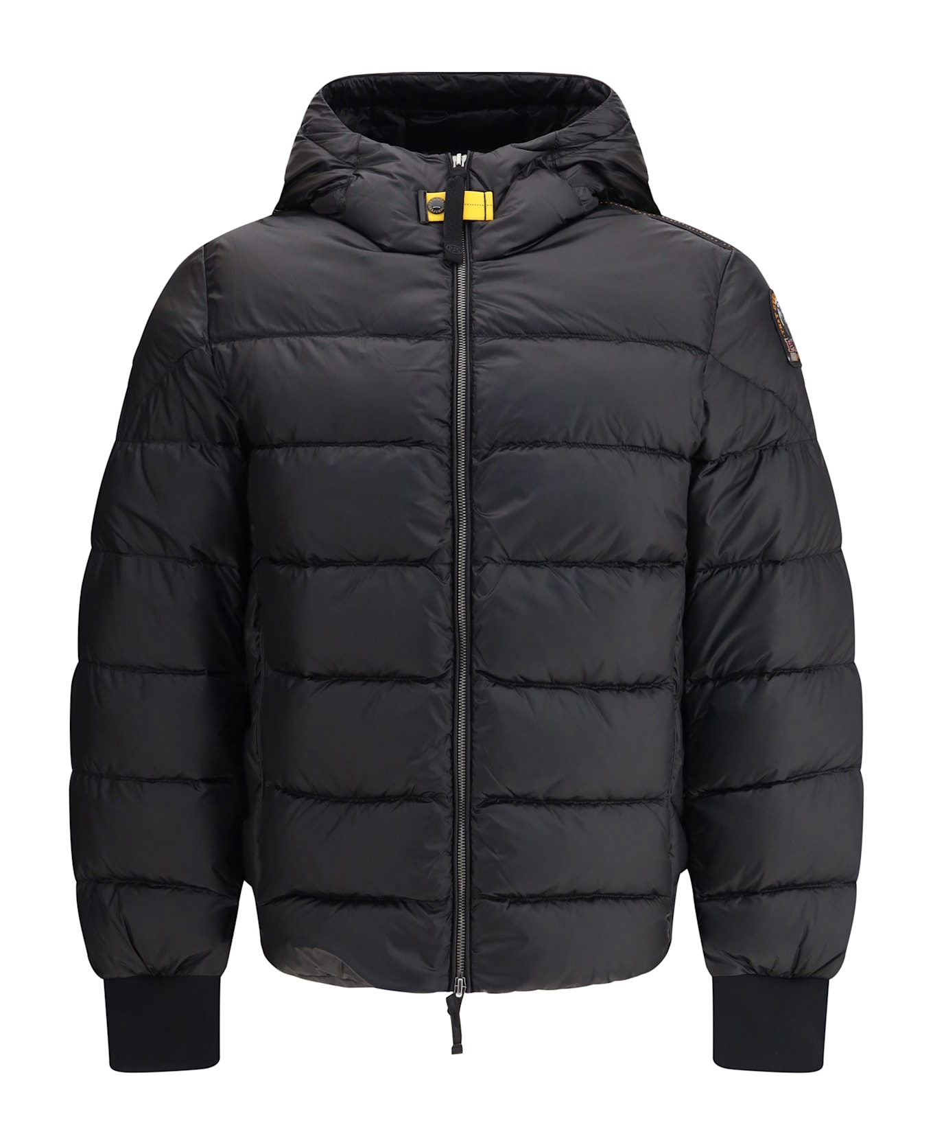 The pharrell down jacket by parajumpers features an adjustable drawstring hood and front closure with a double-slider zipper. it features two exterior zippered pockets and two interior pockets, as well as underarm ventilation. the cuffs and bottom are made of elastic rib for a snug fit. the parajumpers patch on the sleeve and the iconic yellow tape fastening on the collar complete the design.