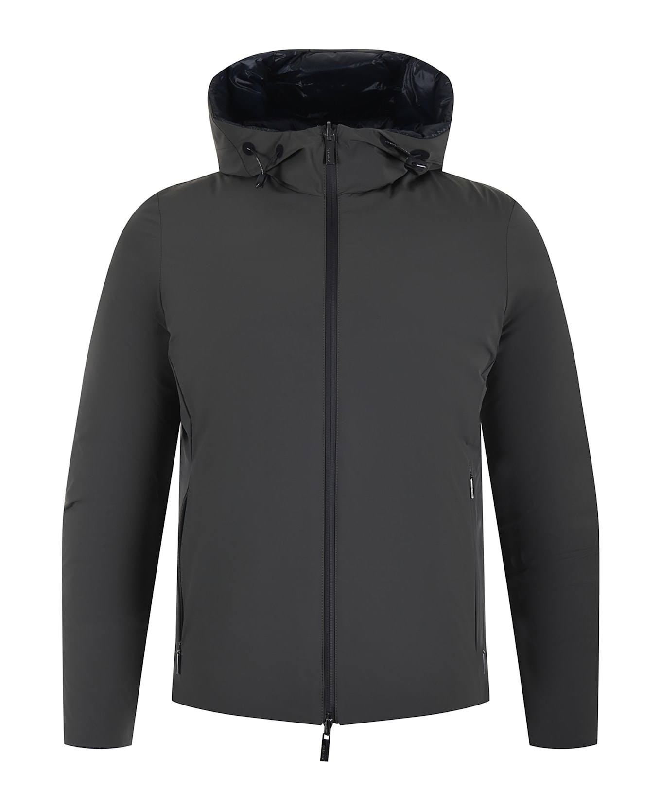 RRD reversible down jacket in dark green stretch technical fabric on one side, and dark blue quilted shiny nylon. Feather padded. Hood. Zip pockets. Double slider zip closure. Rubberized logo on the left sleeve. Size in photo 48 80% polyamide, 20% elastane 100% polyamide Padding: 90% down, 10% feather