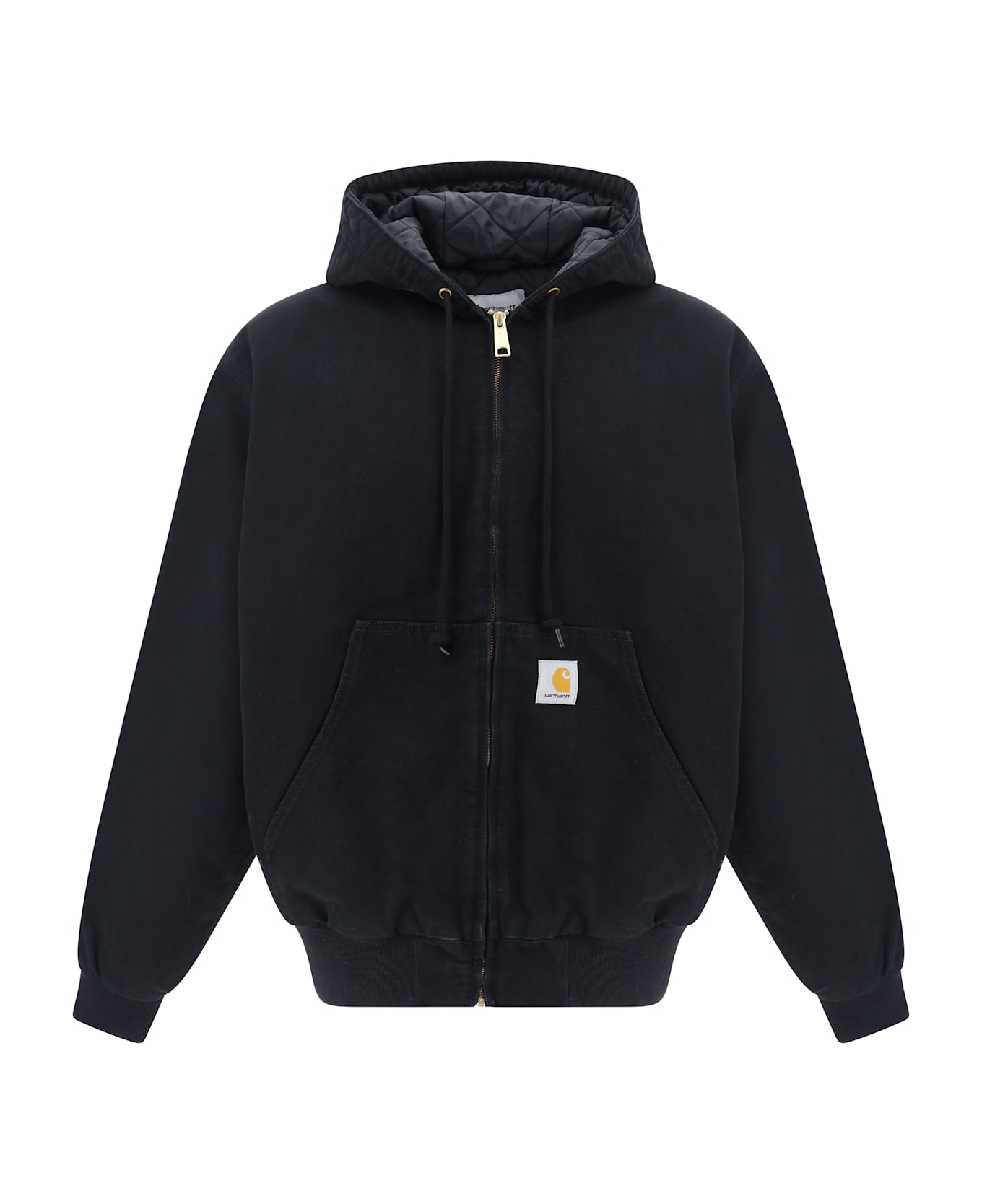 Cotton active jacket by carhartt wip, front zipper closure, drawstring-adjustable hood, ribbed hem, monochrome design, ribbed hem, two side pockets with iconic brand logo applied in contrast, padded denim pattern, monochrome design, regular fit.