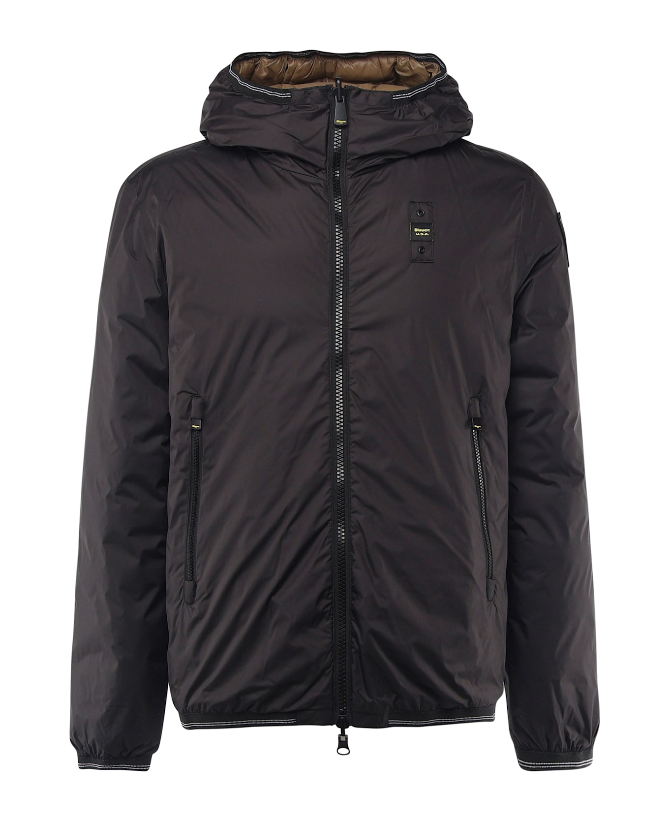 -Reversible jacket, smooth on one side and with horizontal taped seams on the other -Fixed hood -Made of nylon -Lined with contrasting color nylon -Padded with Repreve® wadding -Zip closure -Zip pockets on one side and snap button pockets on the other -Striped elastic in tone on the hood, cuffs, and hem -Patch on the smooth side and logo loop on both versions -Colour: Black