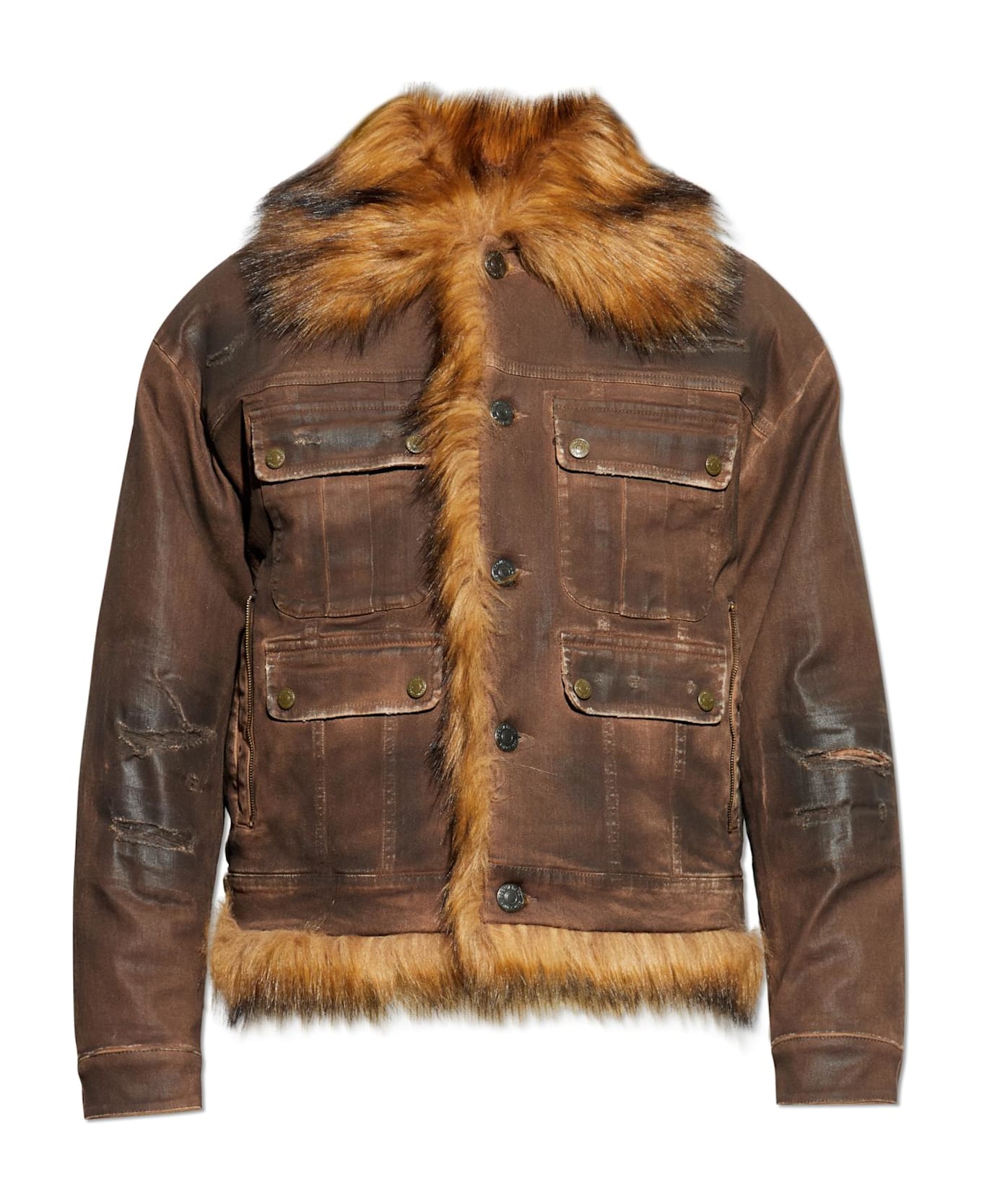 This insulated denim jacket from Dsquared2 seamlessly bridges American glamour with refined Italian design. Crafted from brown denim, it showcases a pronounced raw texture with a subtly distressed finish, highlighted by meticulously stitched seams that signal impeccable craftsmanship. The silhouette is a classic, cropped design with a straight cut and a slightly elongated back complemented by regular sleeves and a traditional collar for time-honored appeal. Distinctive wide trims of plush, brown-russet faux fur line the collar, front closure, and lower hem, adding a touch of opulence and warmth. The jacket closes with bold, gold-toned metal buttons, adorned with signature embossed detailing, elevating its exclusive edge. Inside, the soft quilted lining ensures superior comfort and insulation. Why choose this product? Expertly constructed from premium materials for enduring style Unique faux fur accents for a luxurious, modern statement Timeless silhouette enhanced with elevated design elements Signature touches from Dsquared2 ensure authenticity and prestige