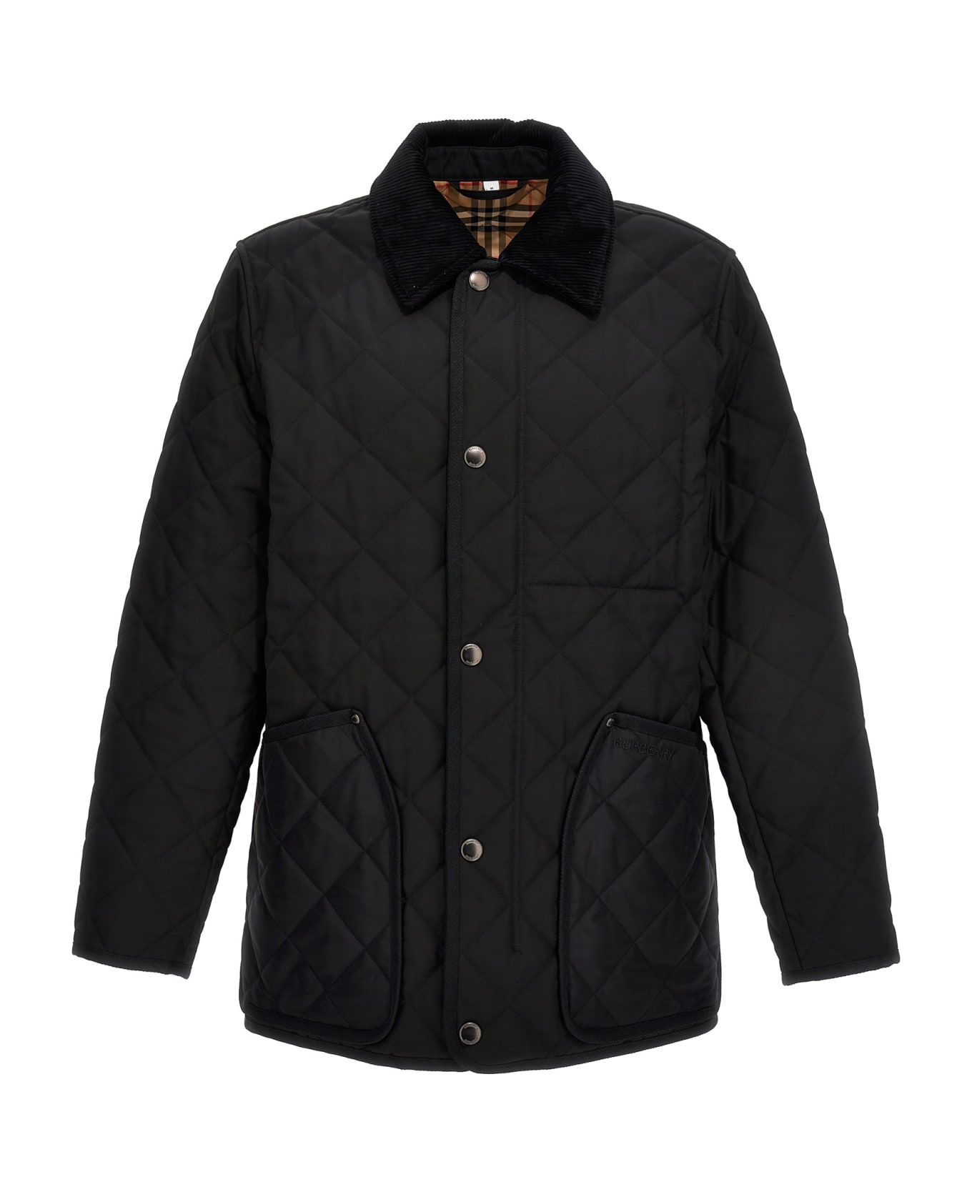 Lanford' diamond-shaped quilted nylon canvas jacket with corduroy collar, vintage check pattern lining, snap button closure, concealed zip closure, snap button patch pockets, inner patch pockets, snap button cuffs, side splits with snap buttons, and an embroidered logo.