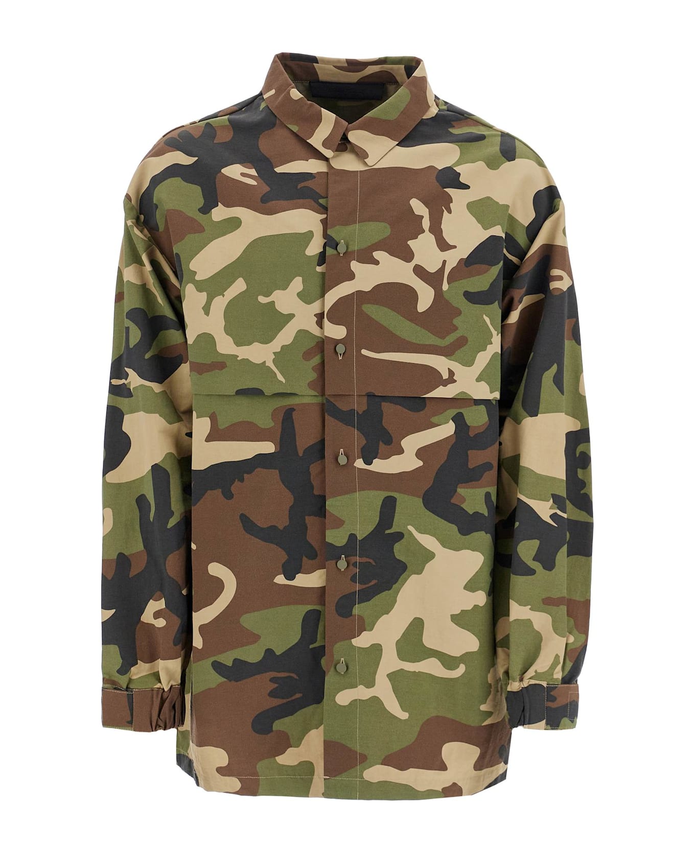 The Fear Of God Essentials Overshirt is made of recycled nylon blend in a camouflage pattern. It features front and back flaps and an oversized fit. The pointed collar, button closure, and adjustable cuffs with velcro add to its unique design. Unlined. The model is 182 cm tall and wears size M.