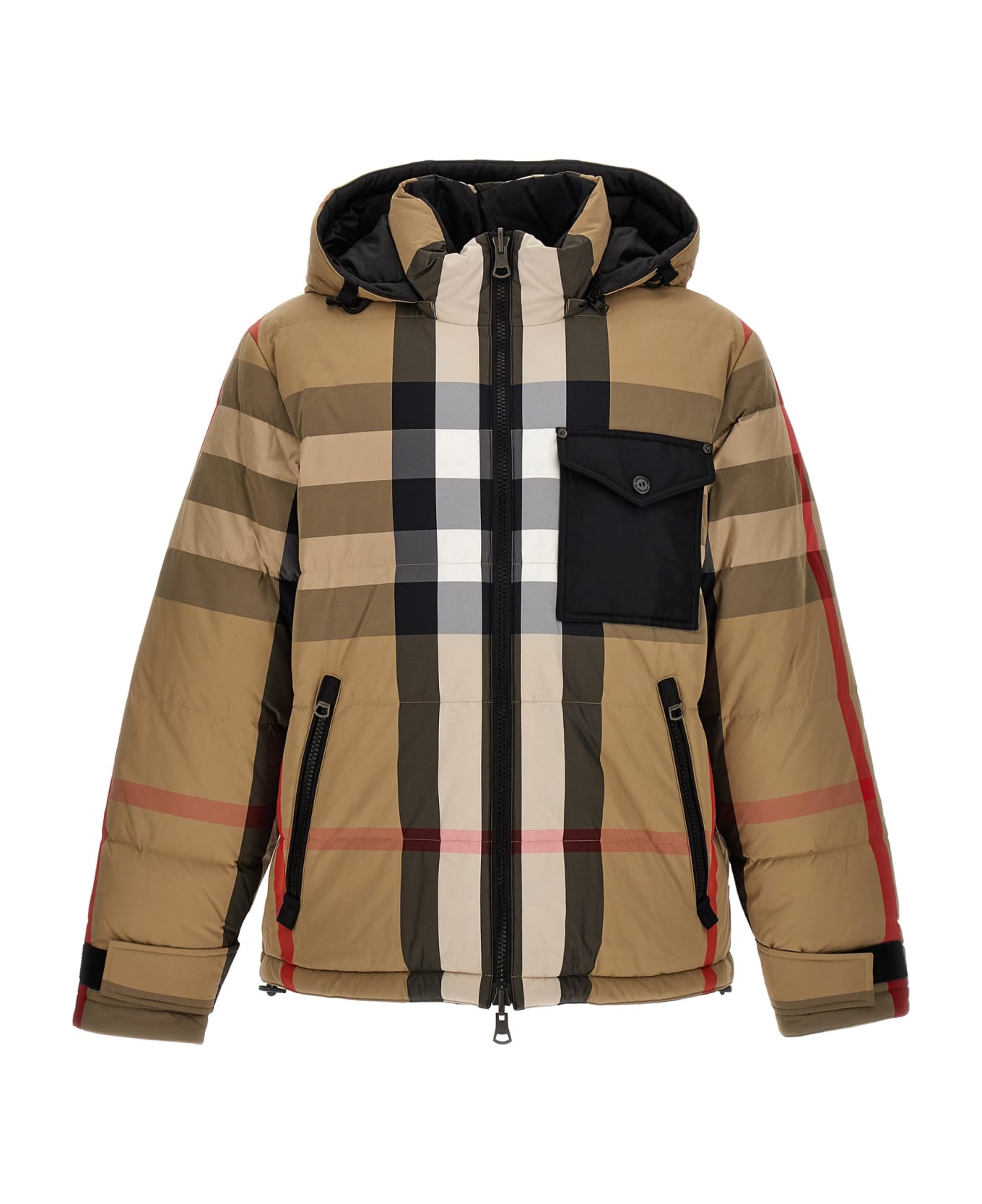 Rutland reversible down jacket in check nylon on one side and solid-color on the other with removable hood, pockets, long sleeves with adjustable cuffs, and adjustable drawstring at bottom. Composition: 100% polyamide