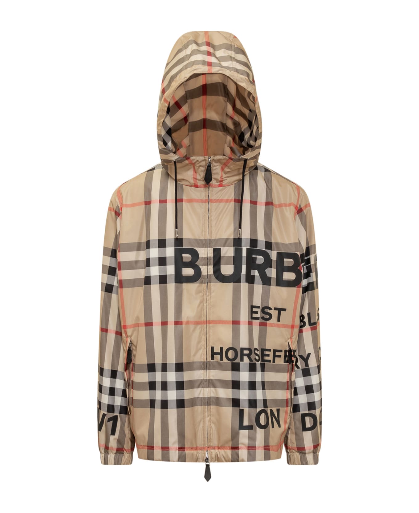 Hooded jacket. Drawstring hood. Inside zip pocket. Two side pockets. Zip closure. Buttons on cuffs. Check all over reason. Composition: 100% Polyamide