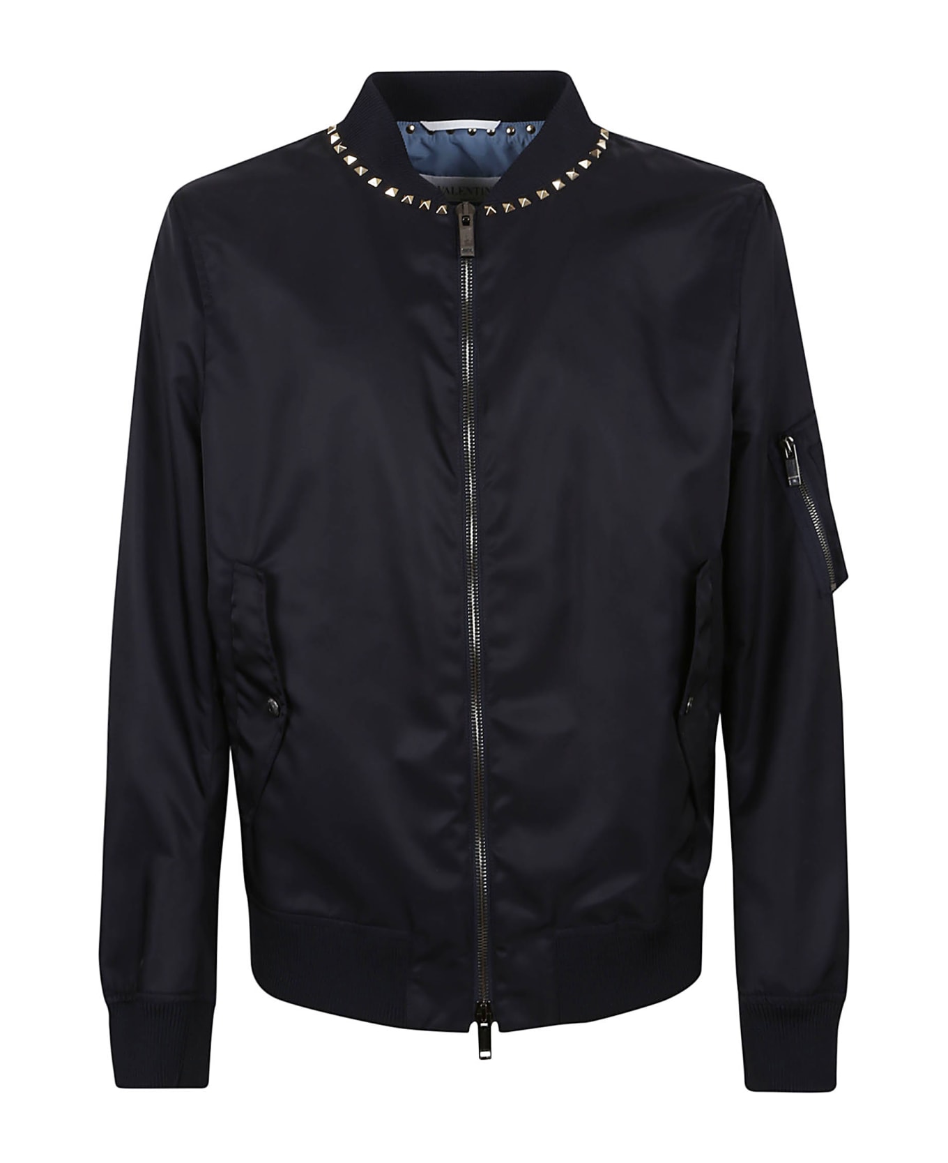 Nylon bomber BY VALENTINO. Front closure with double slider zip; two side pockets with flap and button closure and one with zip on the sleeve; bottom, cuffs and collar with ribbed elastic. Featuring Black Untitled studs on the neck. Ideal to be worn for a casual and trendy outfit!