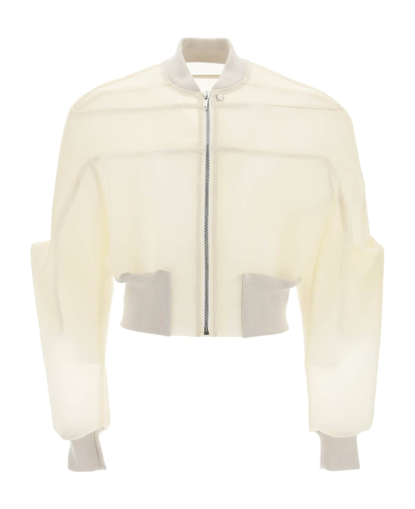 Rick Owens cropped bomber jacket made of semi-transparent girdered leather with wide sleeves, ribbed edges, stiff shoulders. Unlined design featuring zipper and snap-button closure, yoke at front and back, visible topstitching. The model is 187 cm tall and wears a size IT 48.