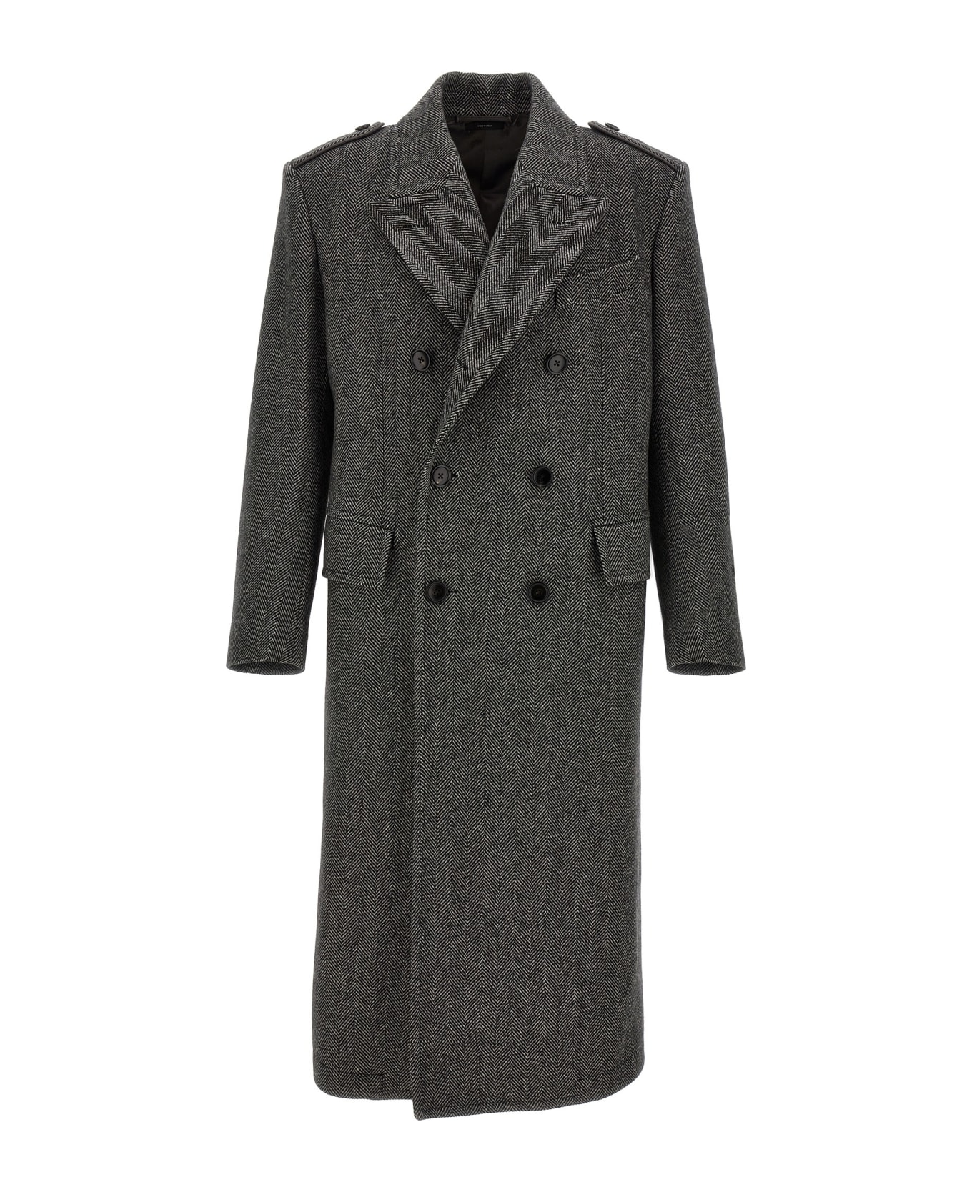 Herringbone wool coat, double breasted with button closure, pockets, long sleeves, back split with buttons and martingale. Composition: 100% virgin wool