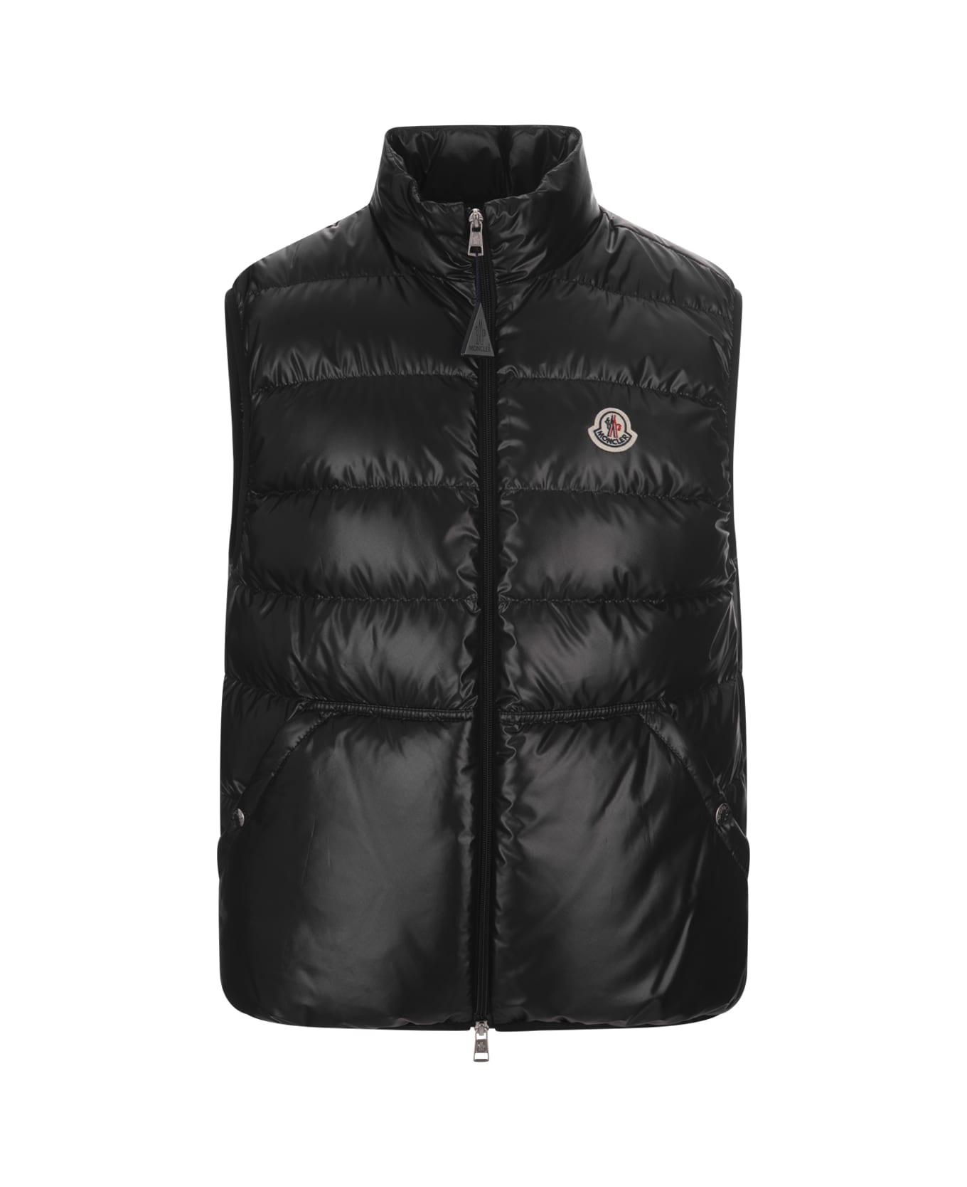 Black Aube padded gilet for men by Moncler made from recycled polyester and featuring iconic shiny texture, down filling, recycled polyester lining, classic raised collar, zip fastening, zipped pockets and elasticated hem. Slim fit.