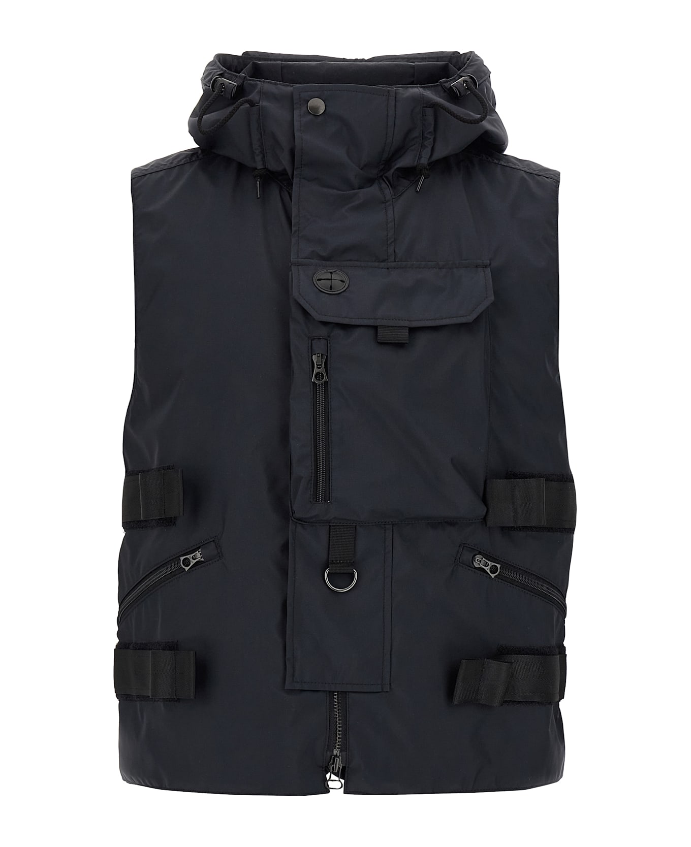 'Junya Watanabe MAN x C. P. Company' vest in technical fabric, double, with removable slightly padded and quilted lining, lens detail on the hood, zip closure.