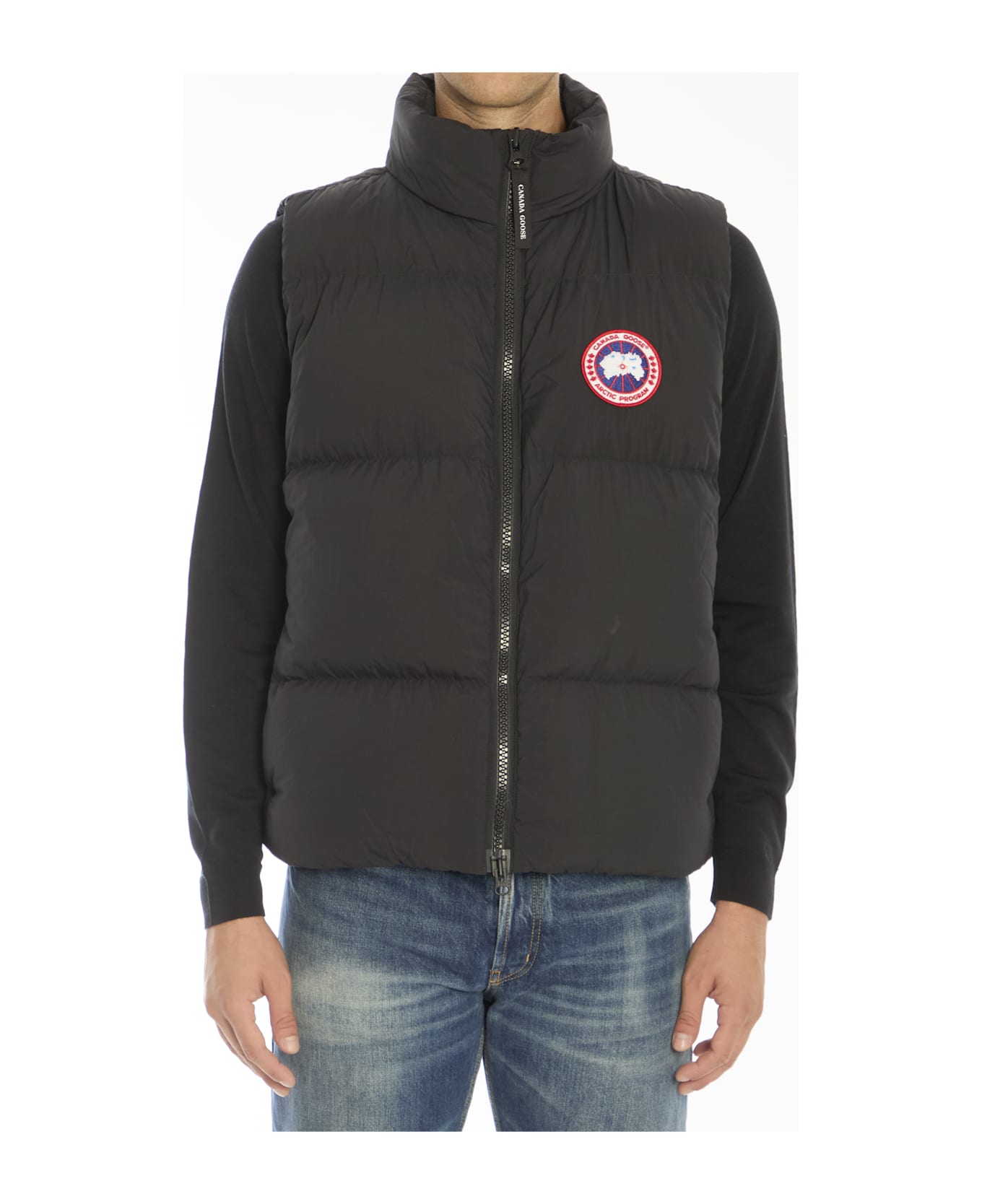 Lawrence puffer vest in black padded nylon with Canada Goose patch on chest. It features high collar, front two-way zip closure and two side zip pockets. Lifetime warranty. Regular fit.