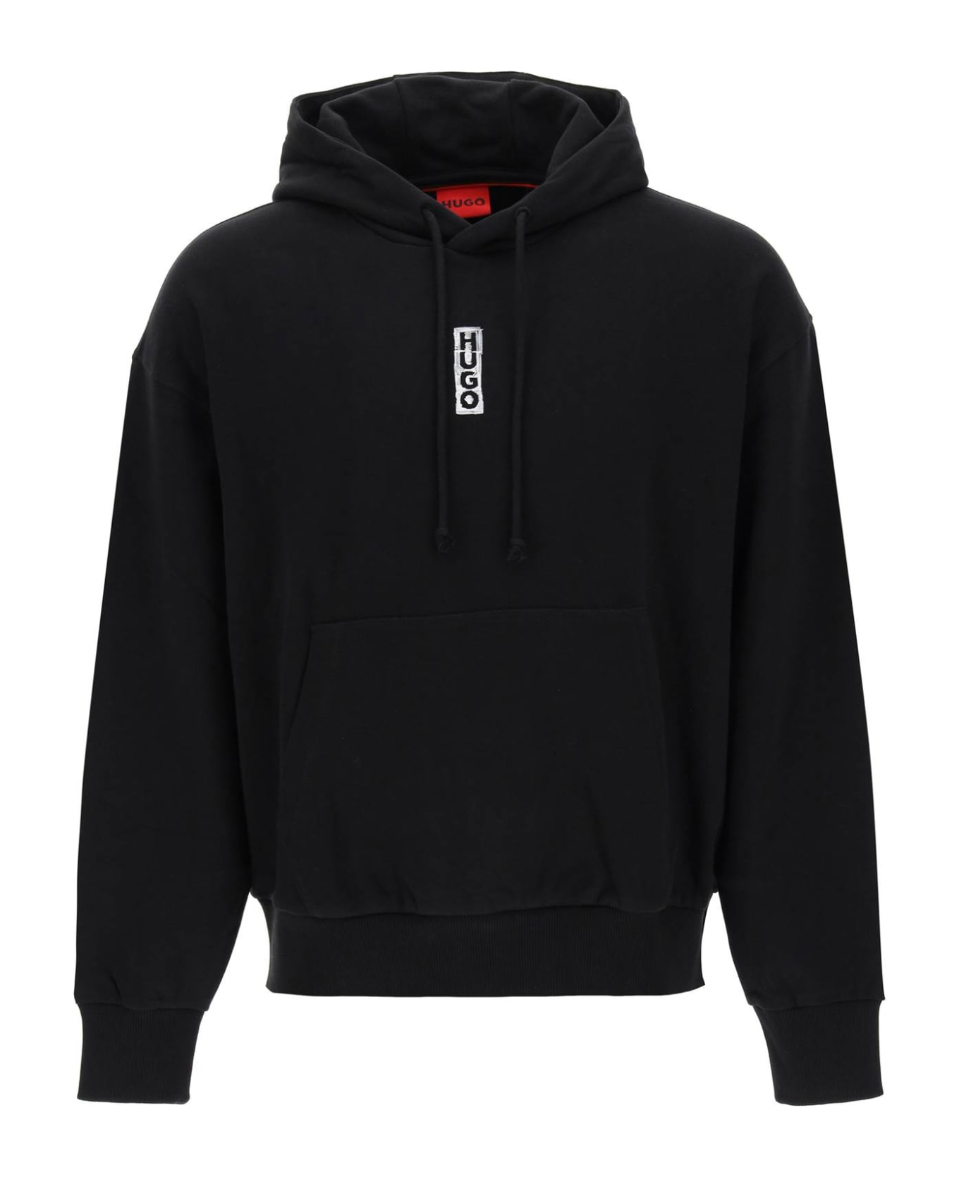 Loop-back cotton jersey sweatshirt printed with a Hugo lettering graphic at the center chest and back. Cut to an oversized fit, it features a drawstring hood, kangaroo pocket, and ribbed cuffs and hem. The model is 187 cm tall and wears a size L.