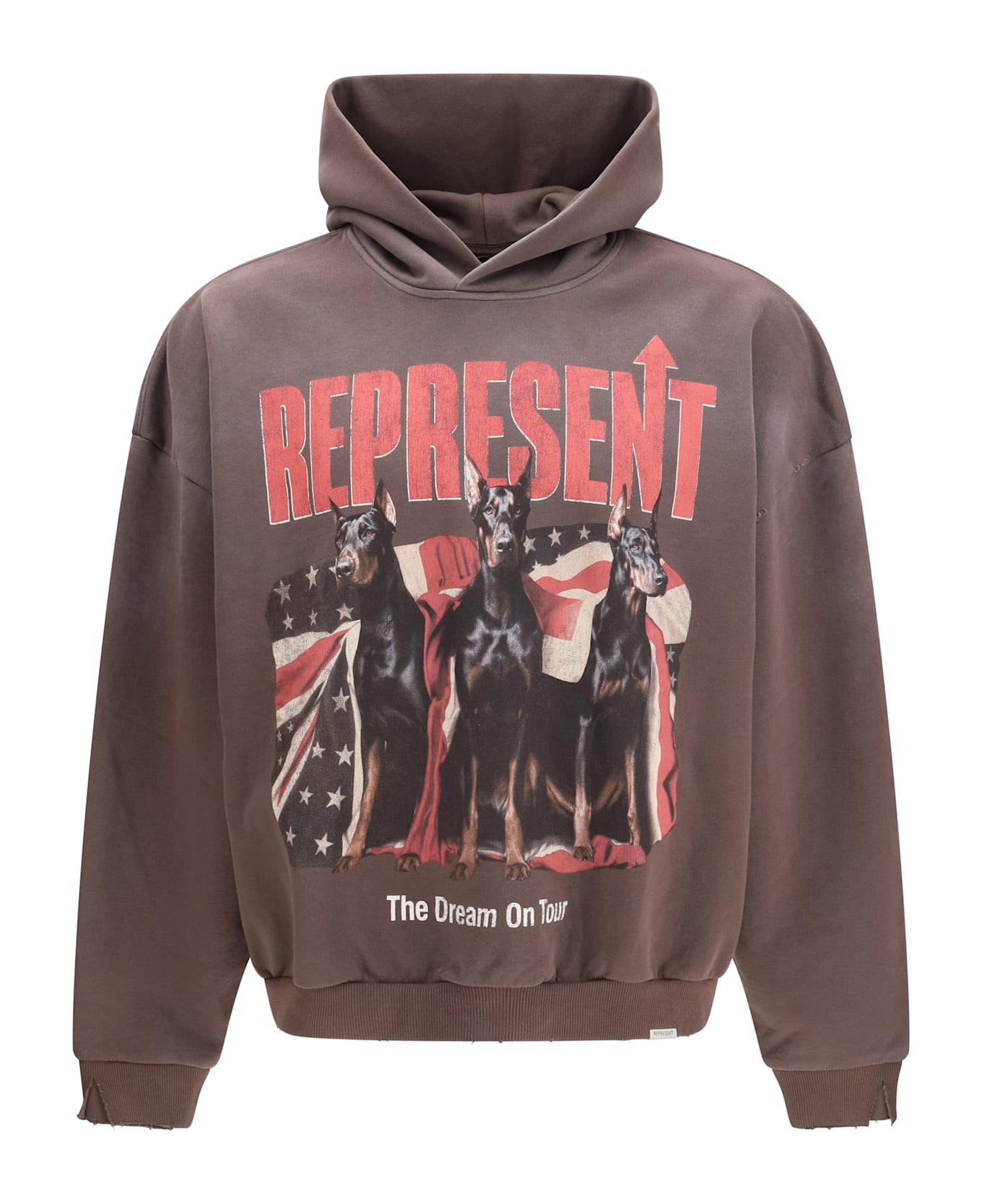 The dream on tour hoodie by represent is made of heavyweight cotton, a hallmark of the brand. the sun-faded finish gives the garment a vintage look, while the kangaroo pocket and ribbed trim complete the design, ensuring comfort and casual style.