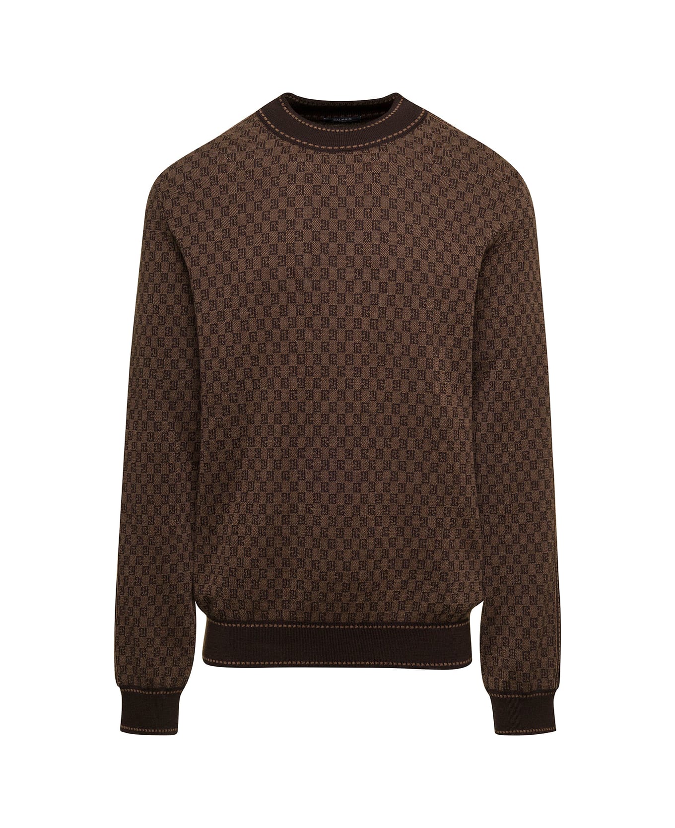 Brown Crewneck Sweater With All-over Retro Monogram Print In Stretch Wool Man