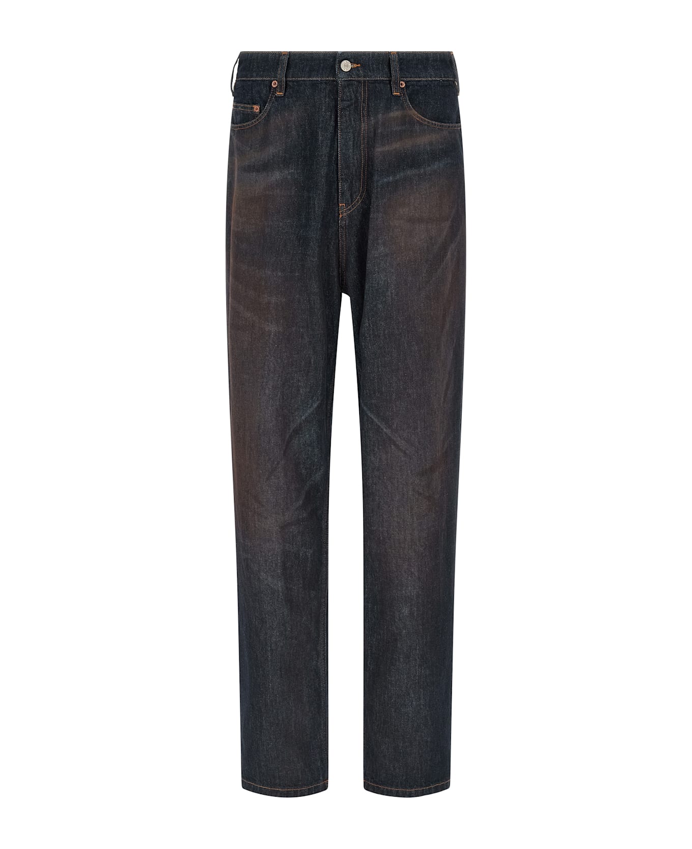 High-waist washed cotton denim jeans with front zip and button closure, straight leg, contrast stitching, leather logo patch on the back pocket. Composition: 100% cotton