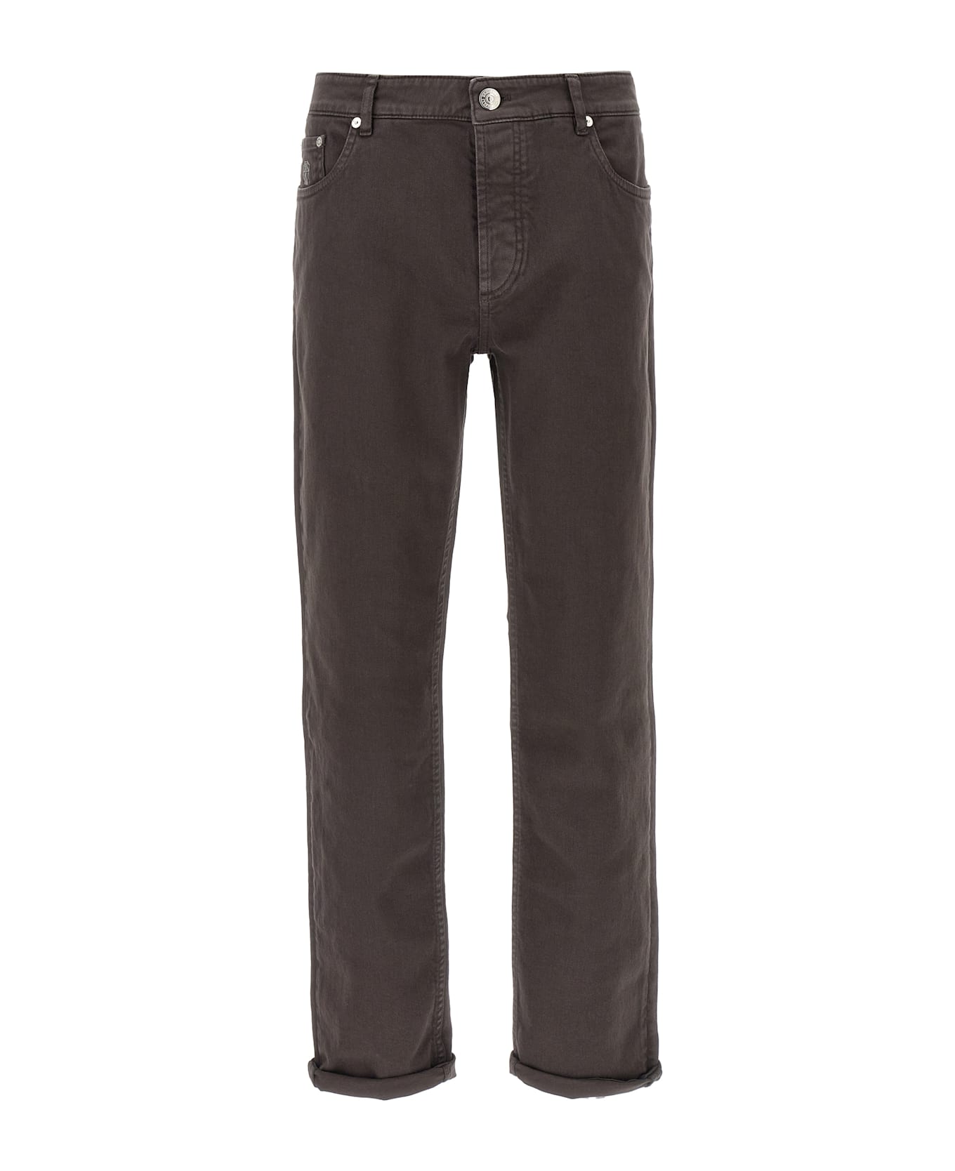 Garment-dyed cotton denim jeans with front logo embroidery, front button closure, five pockets, and leather logo label at the back. Composition: 99% cotton, 1% elastane