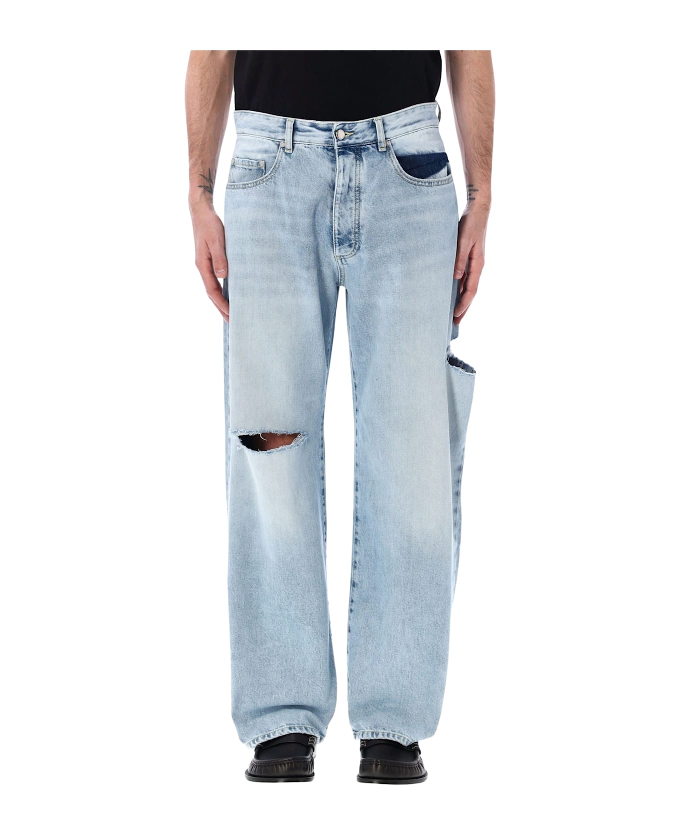 The Scott Wide Leg Jeans By Icon Denim Los Angeles Showcase A Bold Silhouette Defined By Generous Proportions And Structured Rigid Denim. Crafted From Cotton Denim, They Feature A Classic Five-pocket Construction Enhanced By Distressed Cut-out Details Along The Legs. These Men s Wide Leg Jeans Are Designed To Elevate Both Relaxed And Statement-driven Styling. Rigid Cotton Denim Five-pocket Design Wide Leg Silhouette Zip And Button Fastening Distressed Cut Details On The Legs Belt Loops Icon Denim Logo Patch On The Back Embroidery At Back Andrea Is 1,90 M And Wears Size 32