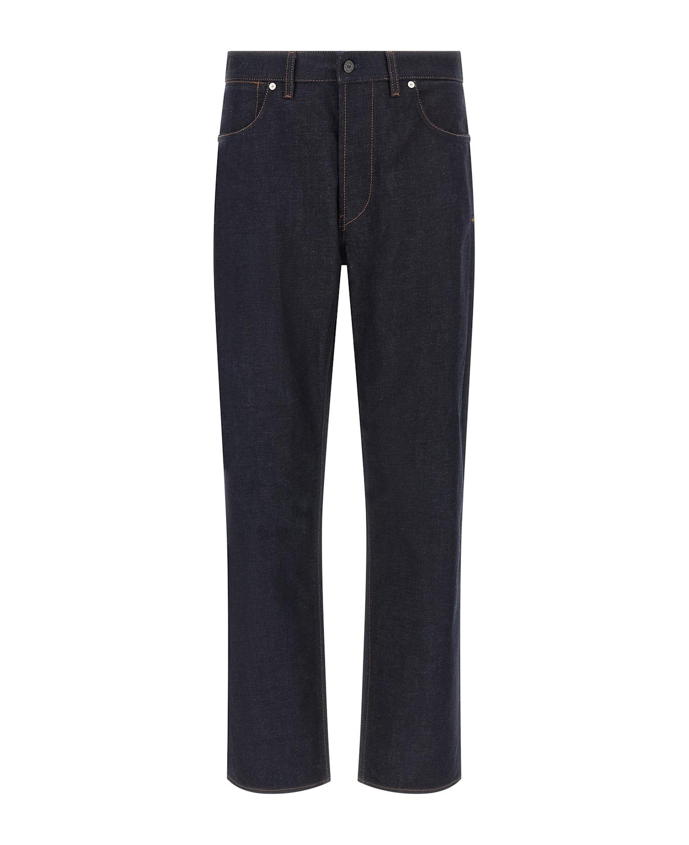 'Indigo Denim-Rinsed' jeans in garment-dyed cotton denim with contrast stitching, straight leg, front button closure, five pockets, logo badge applied at the back. SUSTAINABLE: This product is made of organic cotton. Composition: 100% cotton
