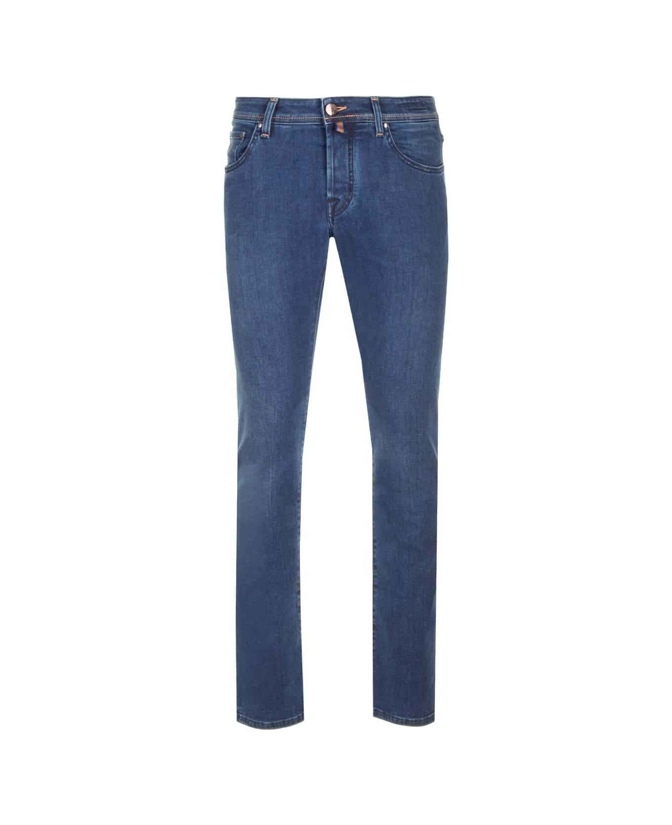 "Nick" slim fit jeans from Jacob Cohen, with low waist, medium blue wash, leather tag with logo, straight and slim leg. Composition: 100% COTTON