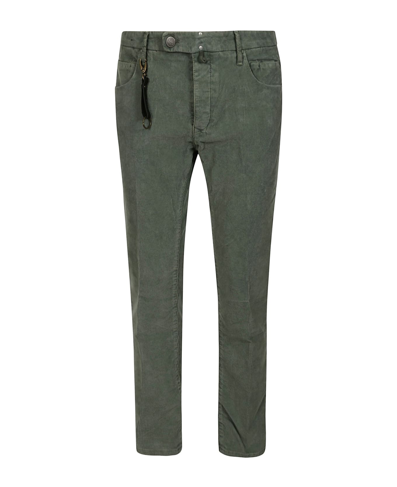 INCOTEX trousers with extended waistband with metal button and metal studs, belt loops, two front flap pockets, applied back pockets. Removable keychain on the front with carabiner hook and antique gold metal ring and leather tab with embossed logo. Tailored slim fit