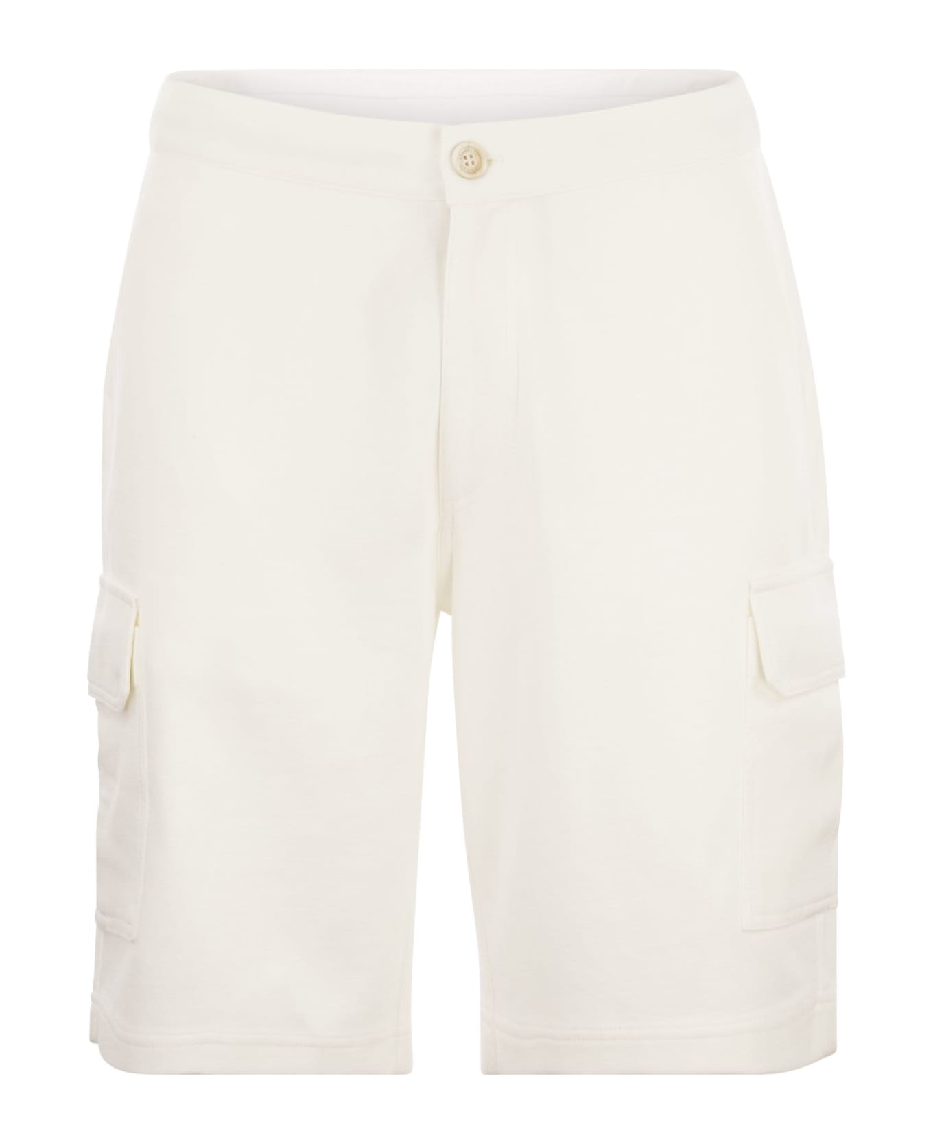 The quality of Brunello Cucinelli materials enriches the Travelwear line, dedicated to moments of relaxation and free time. The bermuda trousers in light techno cotton fleece are characterised by the sporty detail of the cargo pockets and the adjustable drawstring waist. The fit is regular, both on the pelvis and along the thigh. - Zip fastening with button and drawstring - Front pockets - Cargo pockets with flap - Back welt pockets with flap DESIGNER ID: M0T353222G C7220