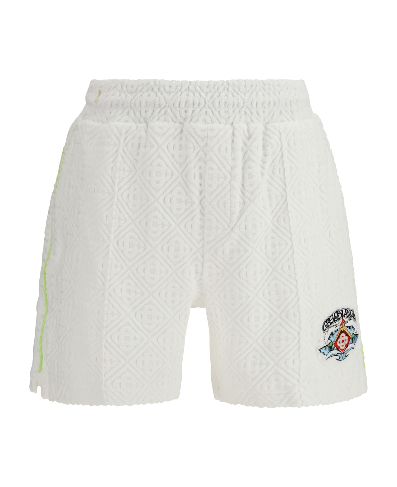 The monogrammed shorts by casablanca combine comfort and style with an elastic waistband and drawstring for a perfect fit. the slanted side pockets and patch back pocket offer practicality, while the visible stitching and piping on the sides add a refined touch. with a casual cut, these shorts are ideal for a relaxed yet elegant look, perfect for summer days and informal occasions.