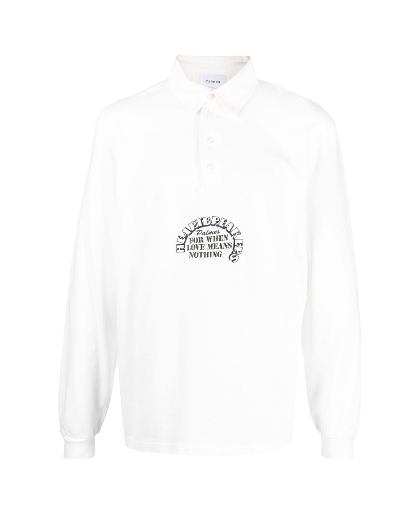 slogan-print pollo shirt from Palmes featuring off-white, organic cotton, classic collar, press-stud fastening, elasticated cuffs and straight hem. This item is made from at least 50% organic materials.. Learn more about what makes a product Conscious on our Conscious Criteria page.