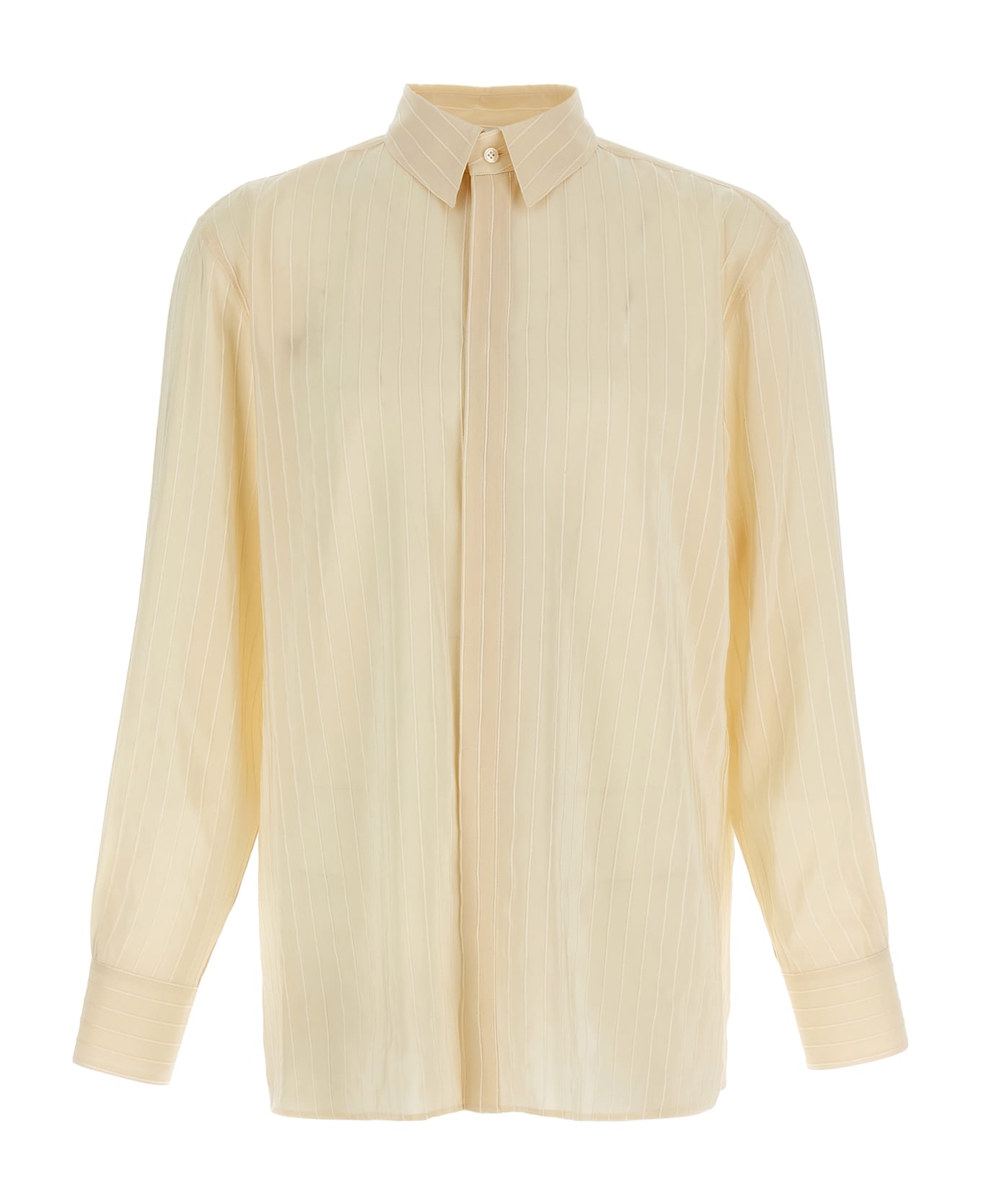 Silk shirt with cotton embroidered stripes, concealed front button closure, long cuffed sleeves.