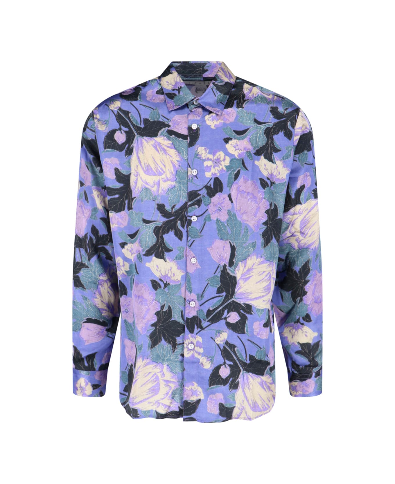 Purple ERL viscose shirt, all-over floral pattern, collar, front button closure, long sleeves, button cuffs, curved hem.