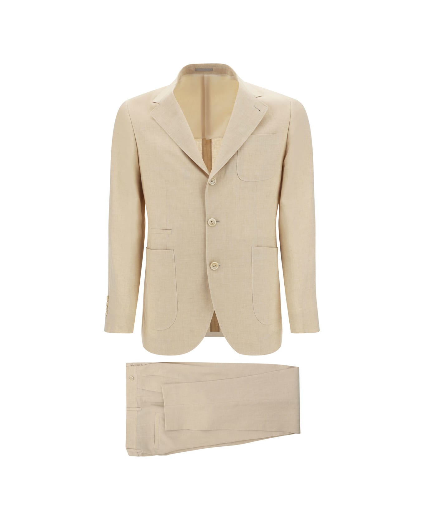 Linen suit by brunello cucinelli, dress composed of jacket and trousers. linen blazer jacket, front closure with matching buttons, two large side patch pockets, classic lapel, a pocket applied on the front, structured shoulders. classic linen trousers, front closure with button and zipper, two side american pockets, two welt pockets on the back, belt loops waist.