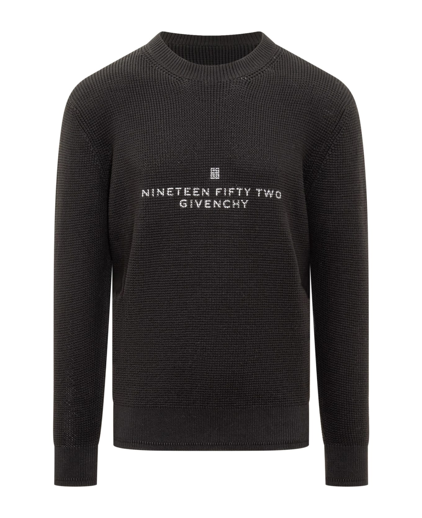 Black sweater. Crew neck. Ribbed collar, hem and cuffs. Knitted. Logo printed on the front.