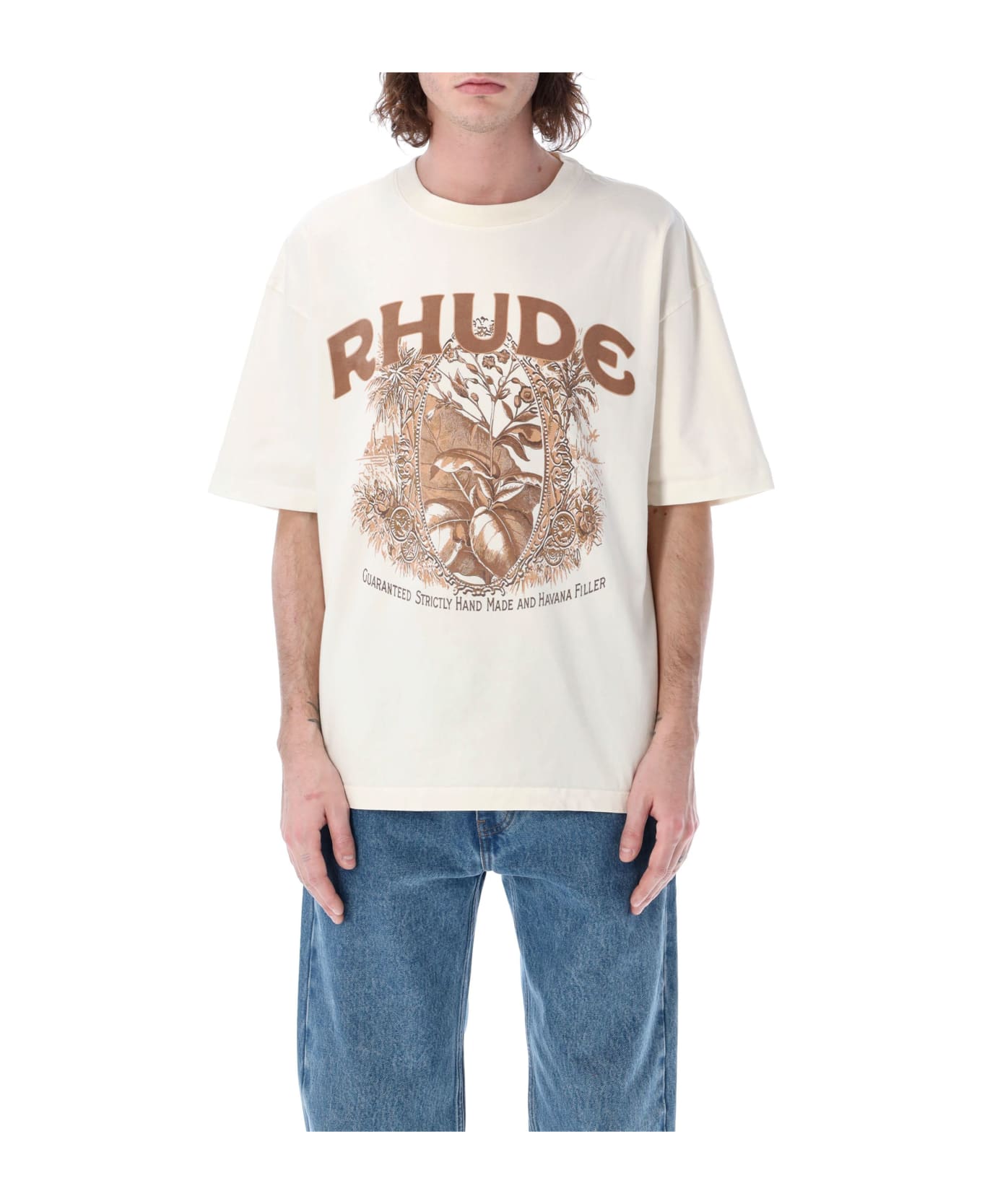 Cotton Cigaro Tee By Rhude. Featuring: Ribbed Crewneck Short Sleeves Graphic And Logo Print At Front Plain Back Straight Hem Model Is 1,90 M Tall And He Is Wearing Size L