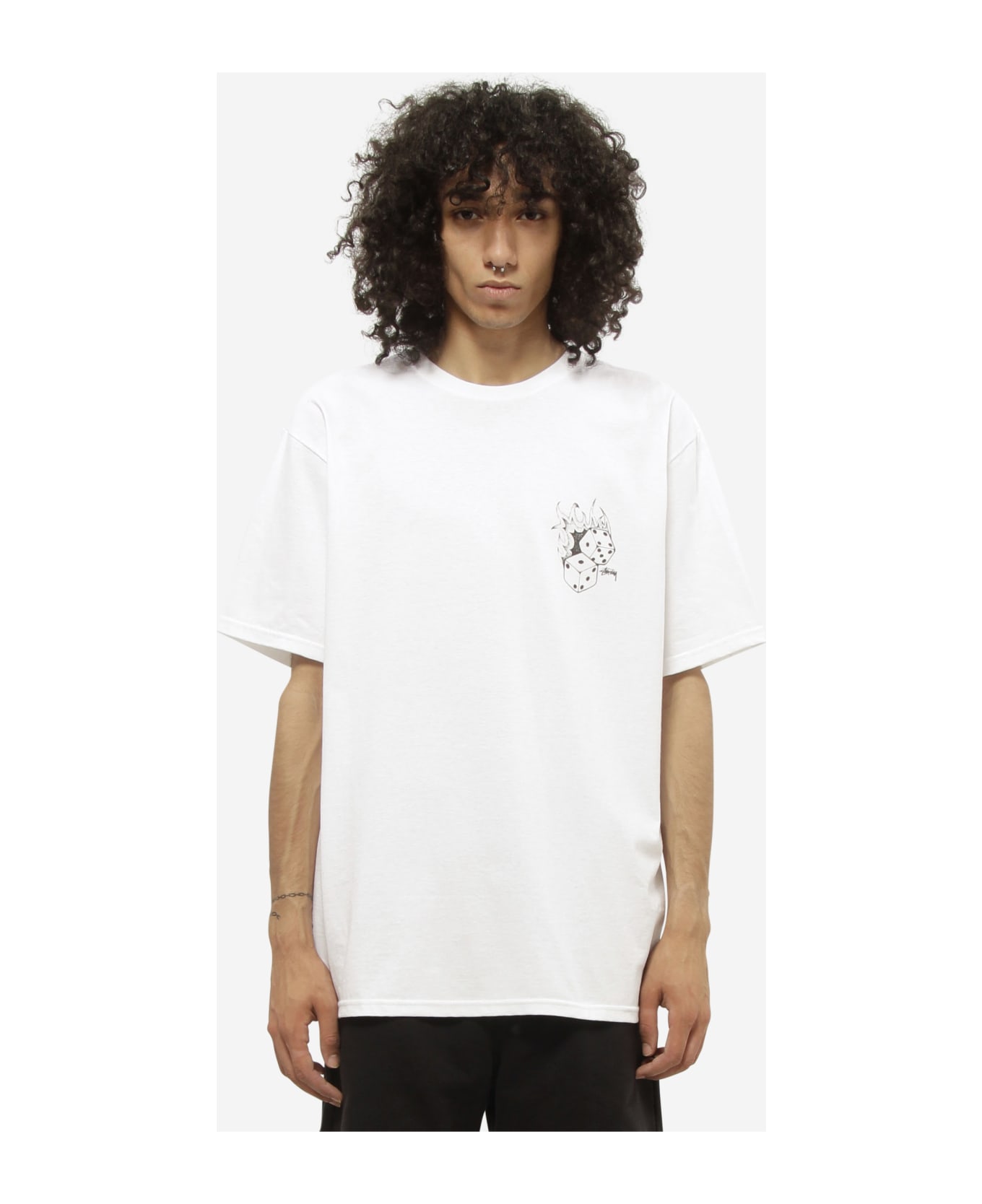 FIRE DICE T-Shirt in white cotton, 100% cotton, short sleeves, crew-neck, straight hem, front and back print, model high is 185 cm, the model wears a size L
