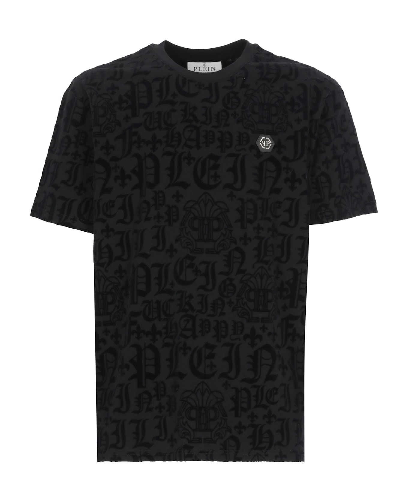 - Black Philipp Plein cotton t-shirt for man - Crewneck - Short sleeves - All-over tone on tone logoed pattern