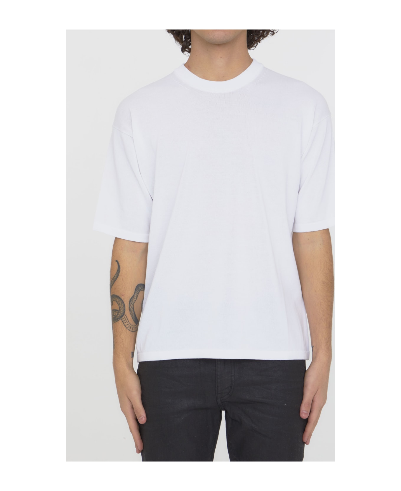 Short-sleeved crewneck jumper in white knit-cotton. Ribbed neck, cuffs and hem. Regular fit.