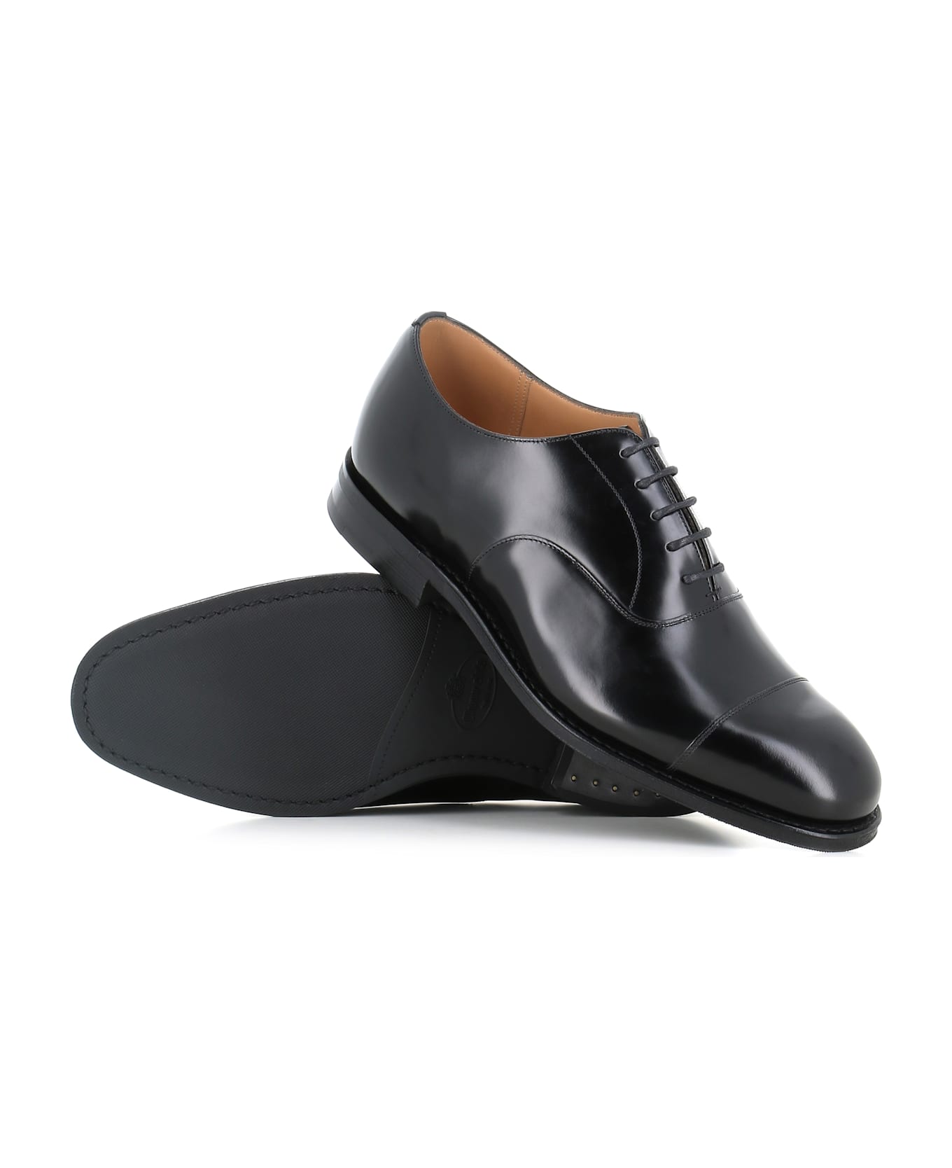Black polishbinder leather men's Oxford shoes by Church's, feauturing by toe seams. Lined interior. Goodyear construction. Rubber sole. Fit: G Heel: 2,5 cm.